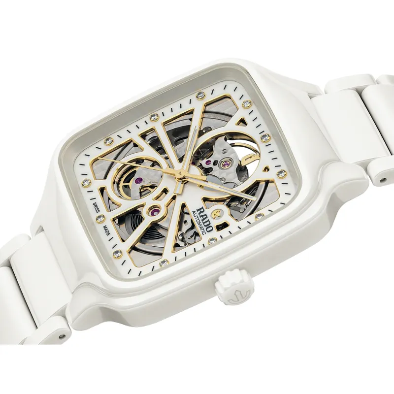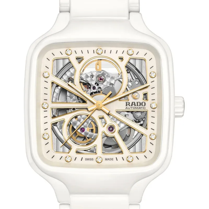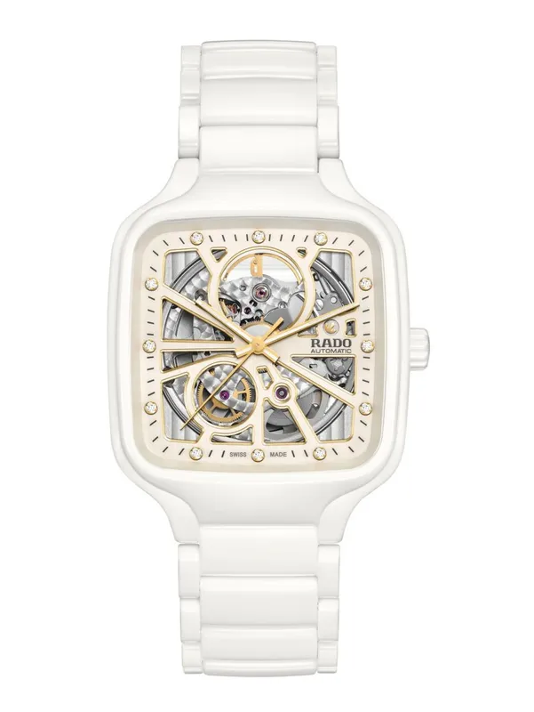 R-60733070 שעון ראדו יבואן רשמי מסדרת טרו | דגם משובץ 12 יהלומים בקרמיקה לבנה | דגמים חדשים עם 5 שנים אחריות | Rado True Square Open Heart Automatic Watch R27073702