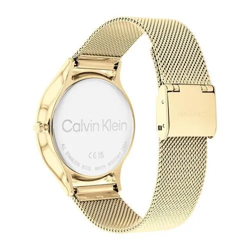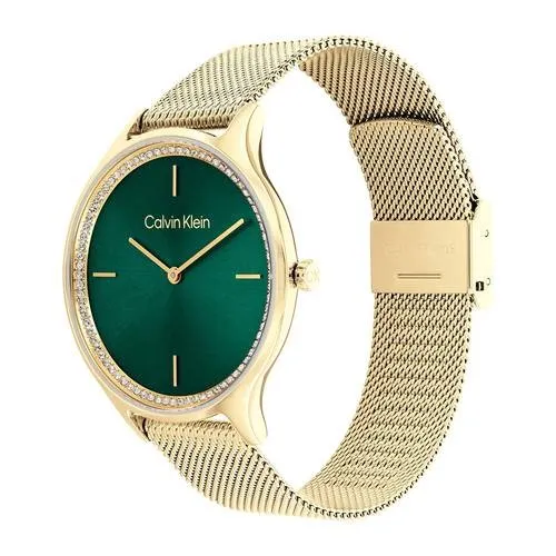 25100005 שעון קלווין קליין לנשים | דגם בלוח ירוק מיוחד משובץ זרקונים | רצועת רשת אופנתית | דגמים חדשים עם שנתיים אחריות | Calvin Klein 25100005 Women's Ionic Thin Gold Plated