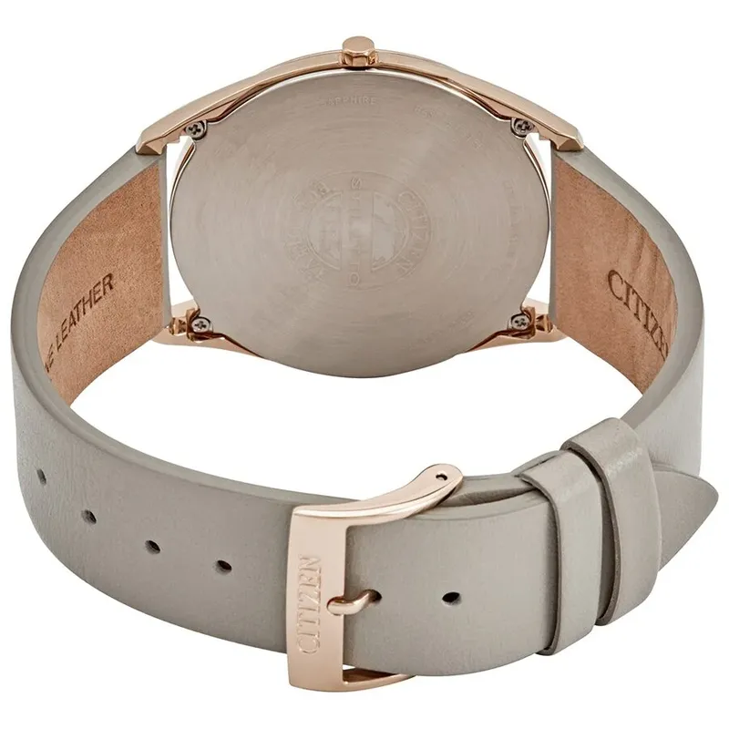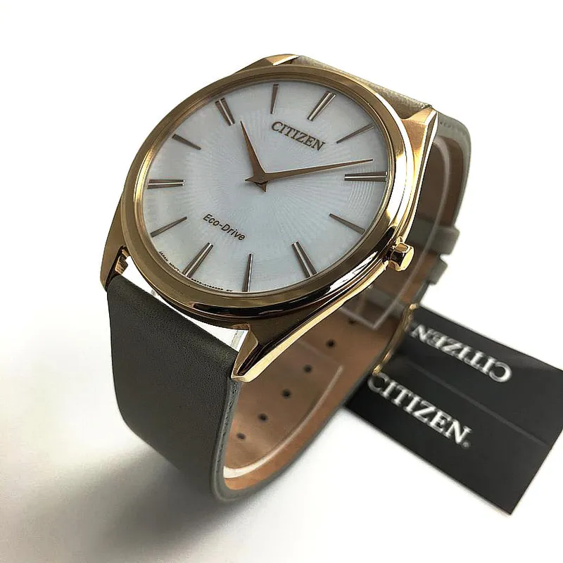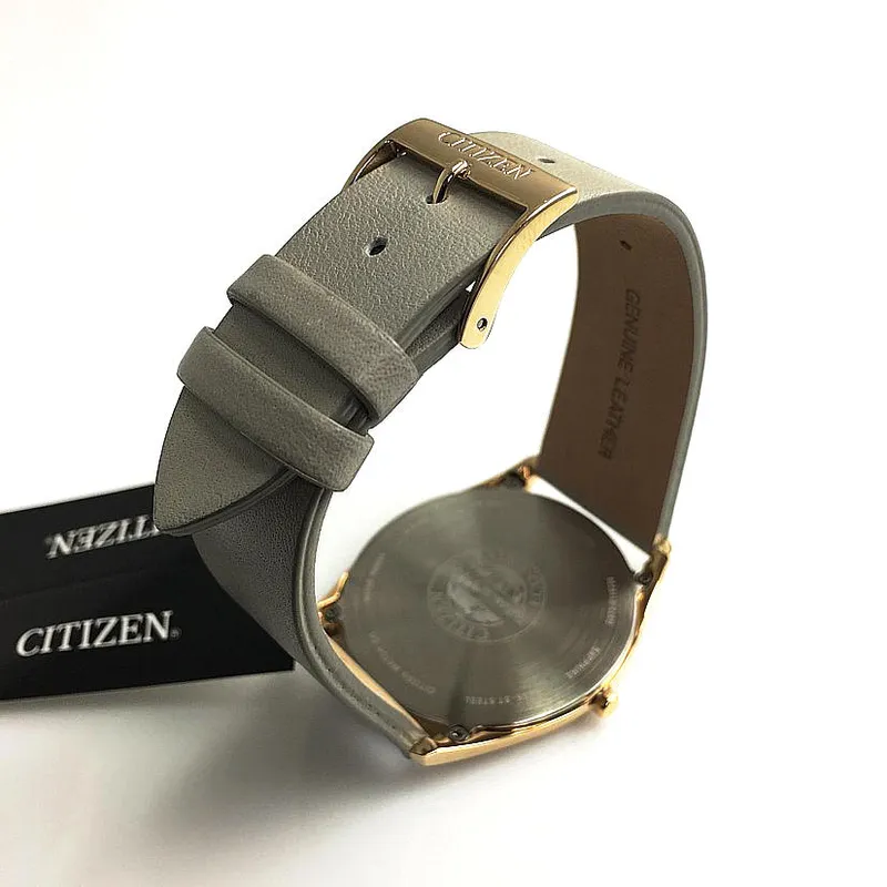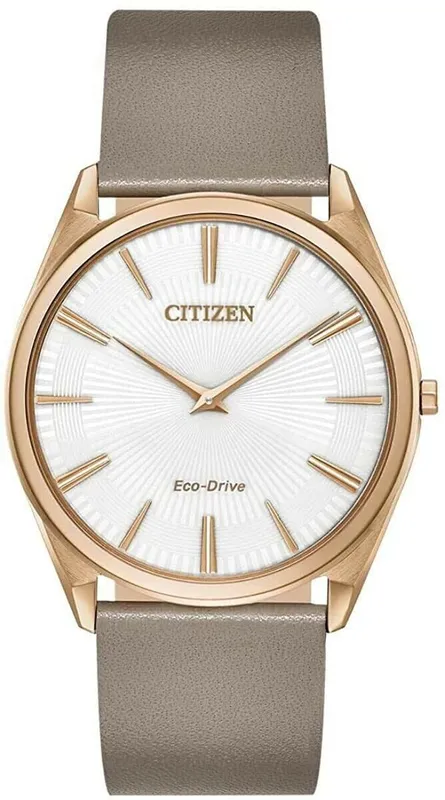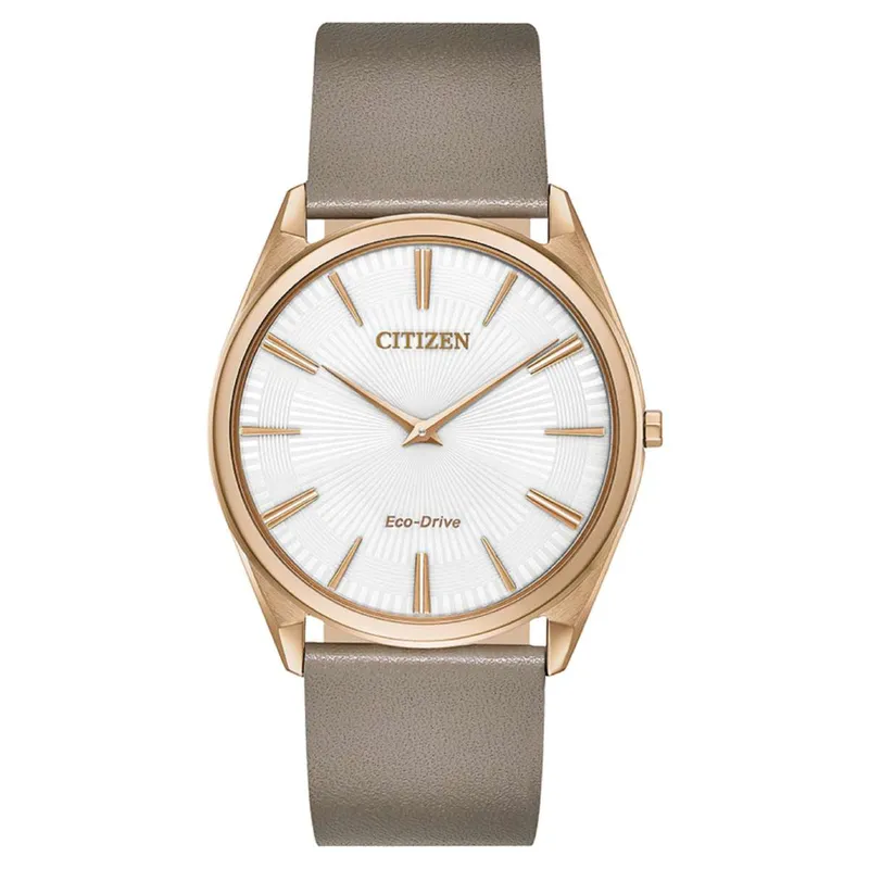 AR3076-08A שעון מיוחד לנשים של סיטיזן יפן מנגנון אקו דרייב | דגם רוז גולד בלוח לבן | שעון גדול ודק במיוחד | רצועתצ עור אפורה | Citizen Women's Stiletto 39mm Eco-Drive Solar Quartz Watch AR3076-08A