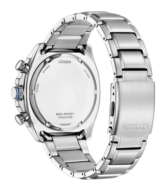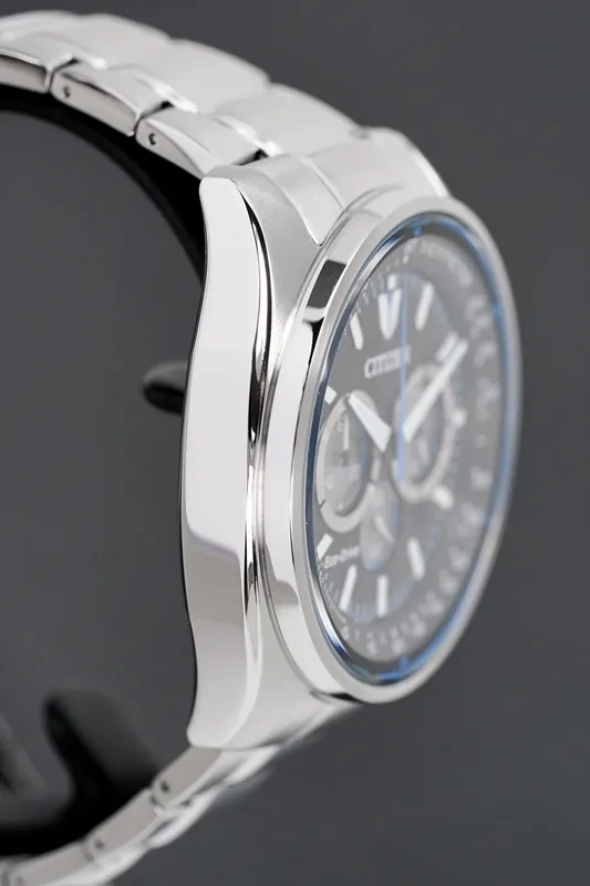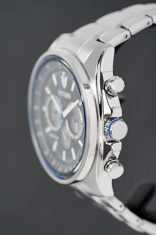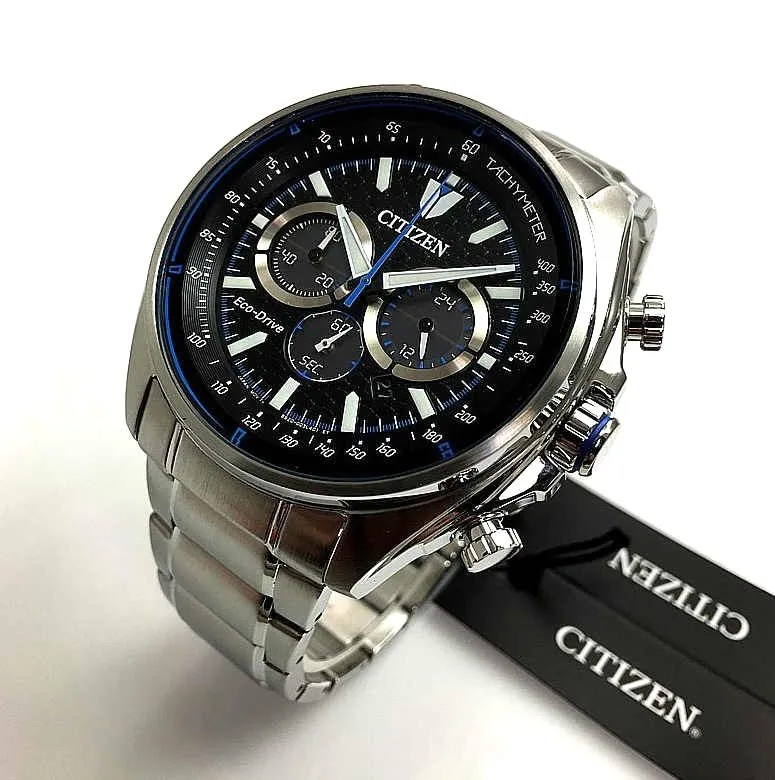 CA4560-81E שעון יד סיטיזן אקו דרייב סולארי לגברים | דגם כרונוגרף בלוח שלו כחול | שעון ספורטיבי אלגנטי | כולל שנתיים אחריות | Citizen Men's Eco-Drive Chronograph Date Indicator Silver Watch 44 MM CA456