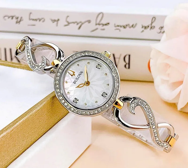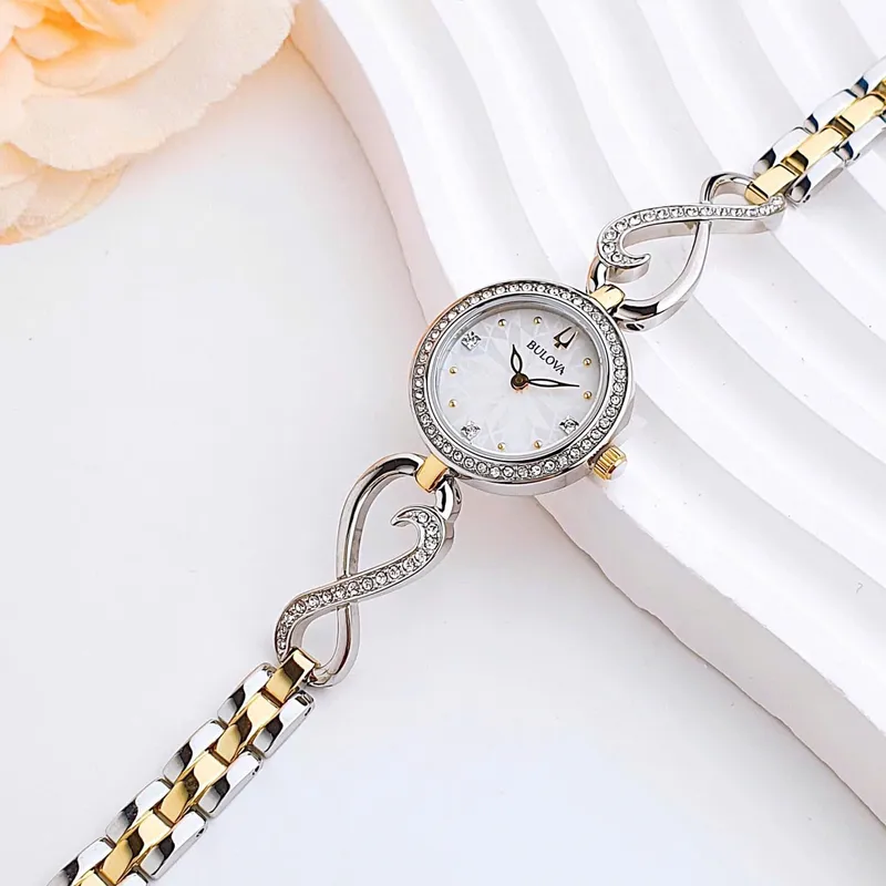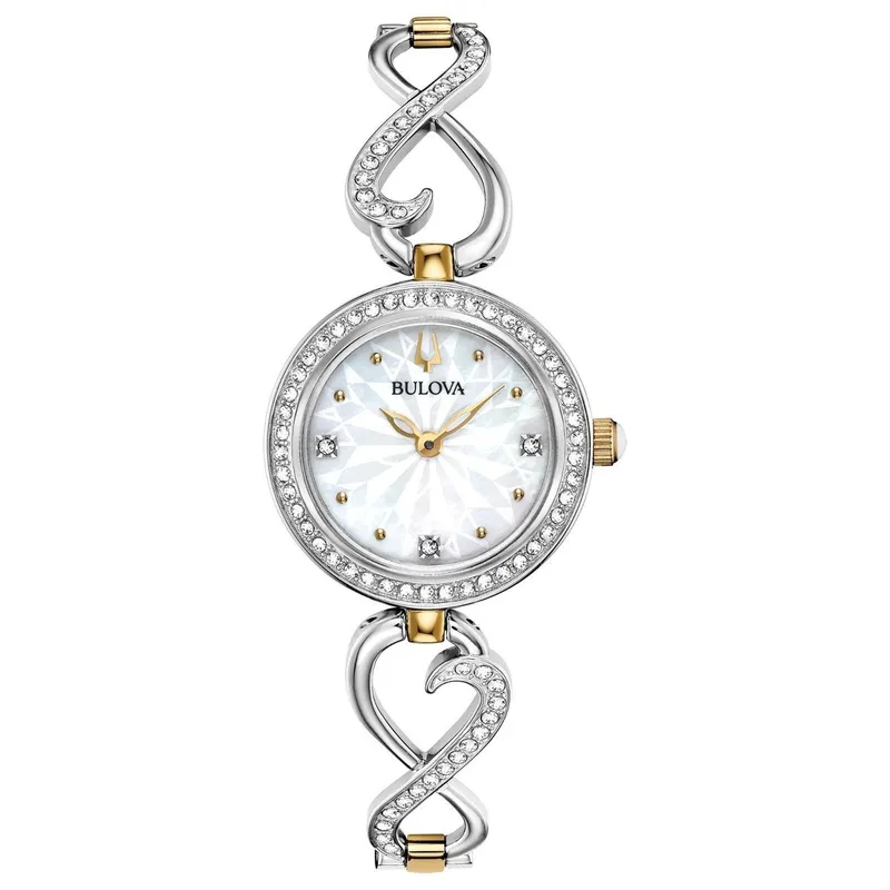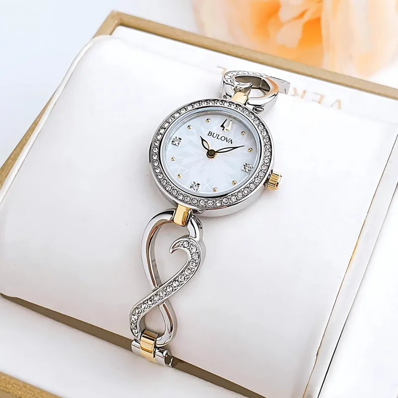 98x120 שעון יד בולובה מארז מתנה כולל שרשרת | דגם לנשים מסדרת אינפינטי | שעון משובץ זרקונים ברצועה משולבת | מלאי מוגבל | שנתיים אחריות | Bulova Womens Two Tone Stainless Steel Watch Boxed Set 98X120