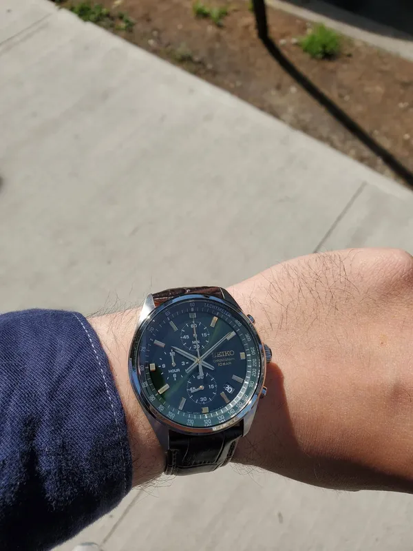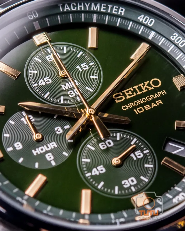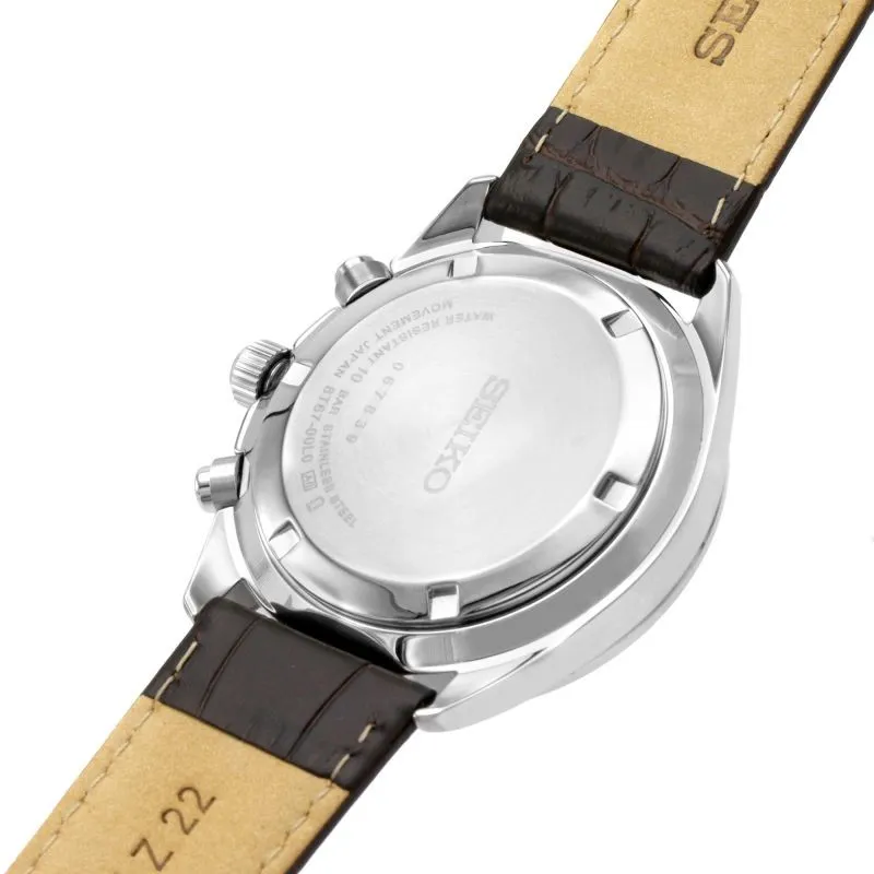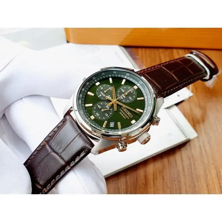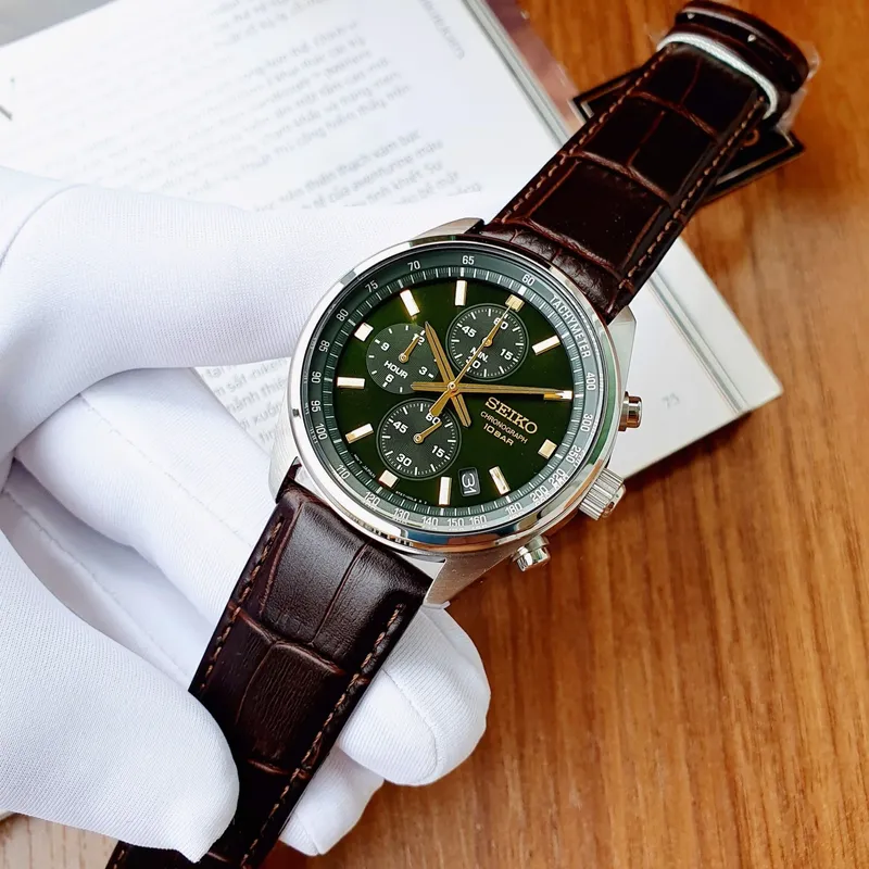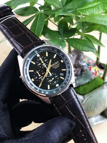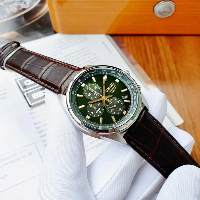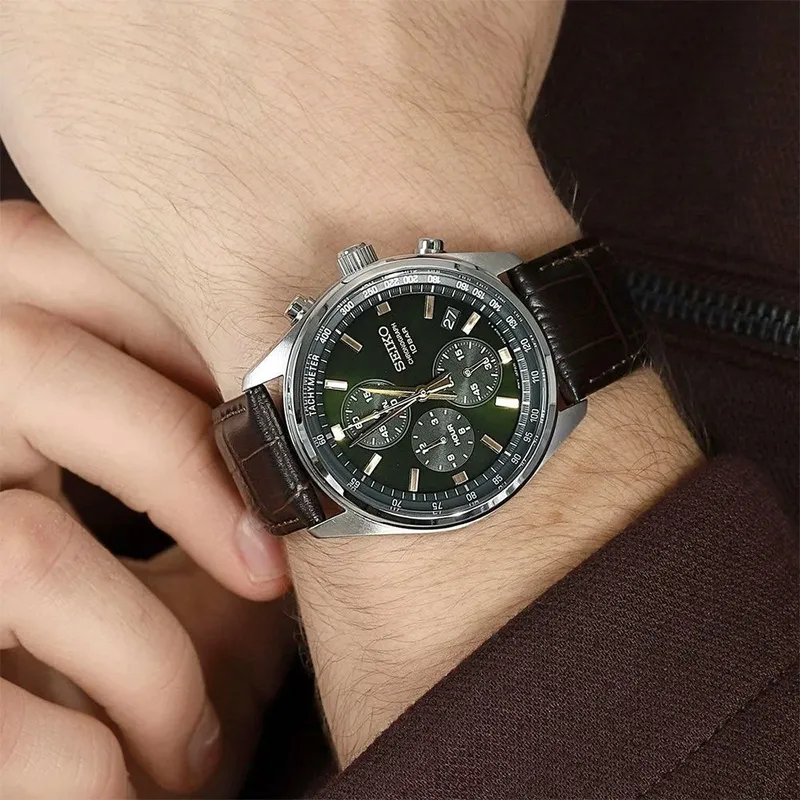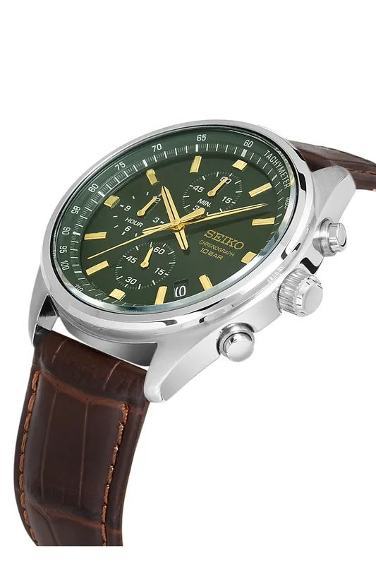SSB385 שעון מהמם של סייקו גברים בלוח ירוק מיוחד משולב זהב | דגם כרונוגרף ברצועת עור חומה | שנתיים אחריות | Seiko Chronograph Quartz Green Dial Gold Hands Indices Men's Watch SSB385