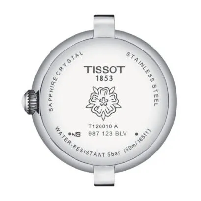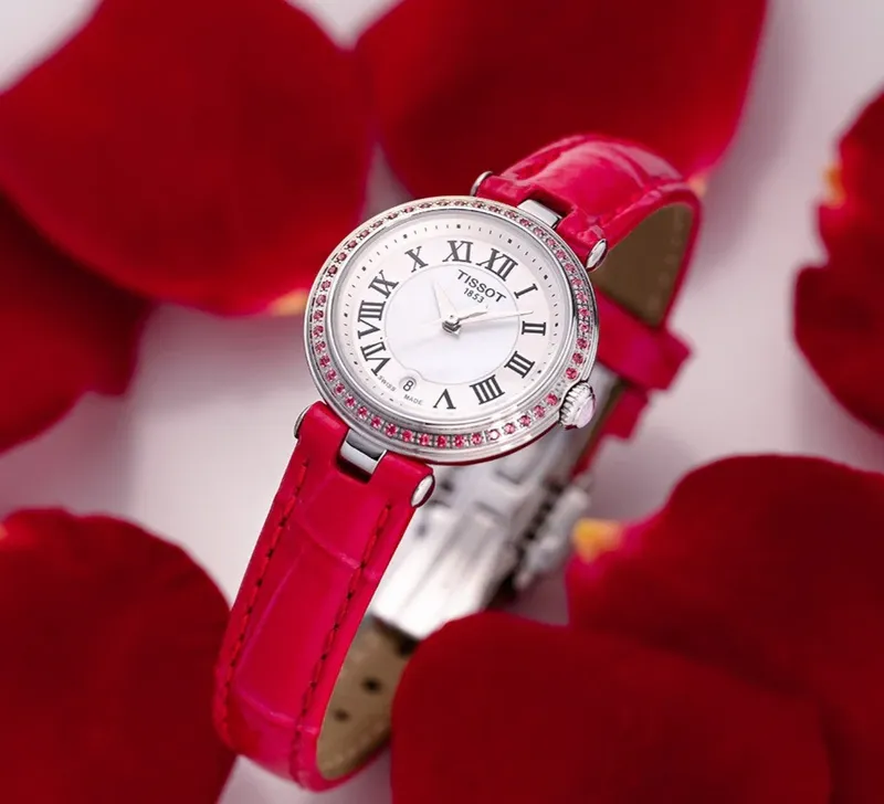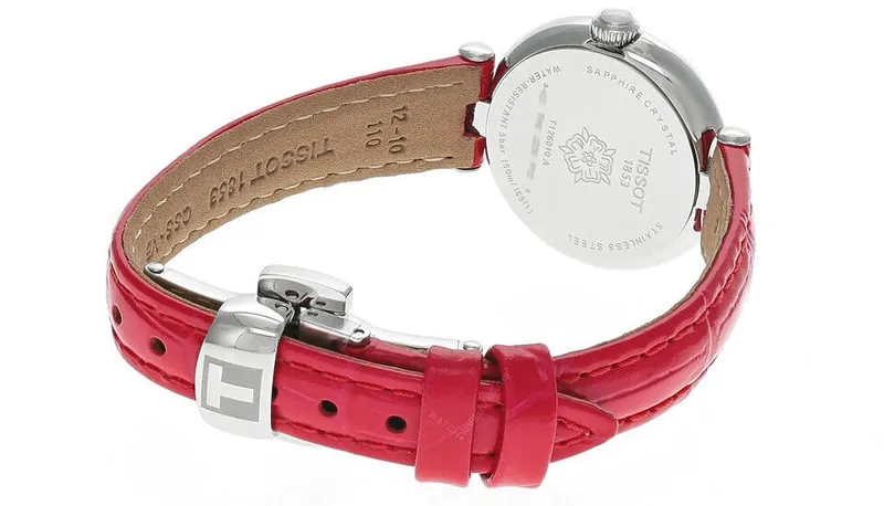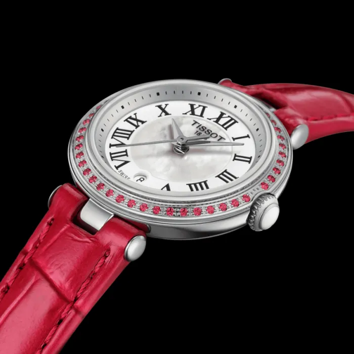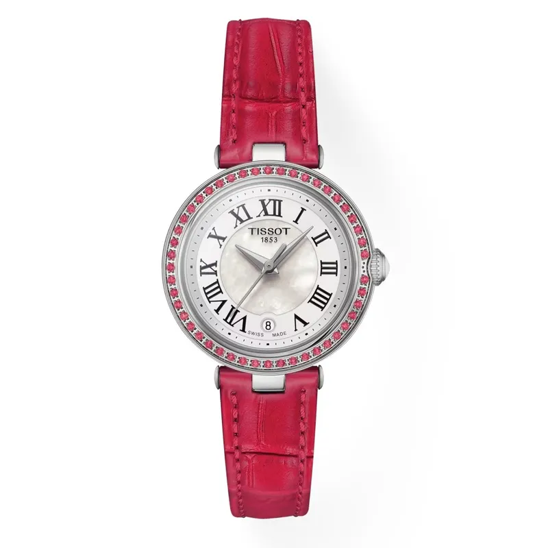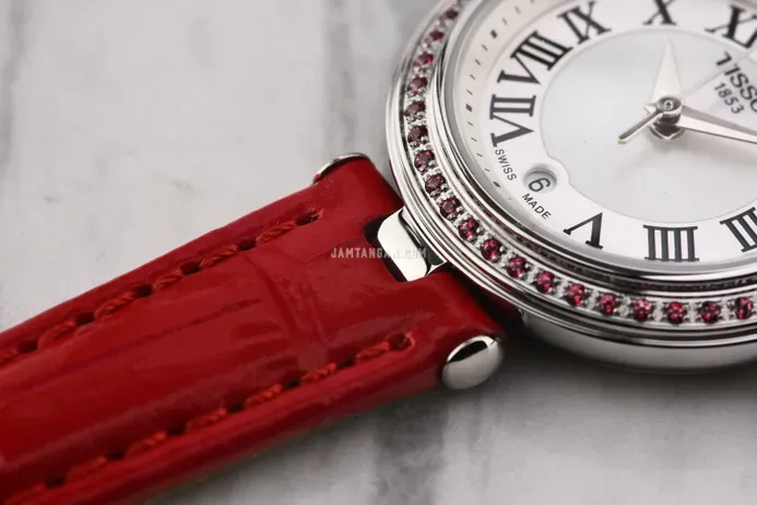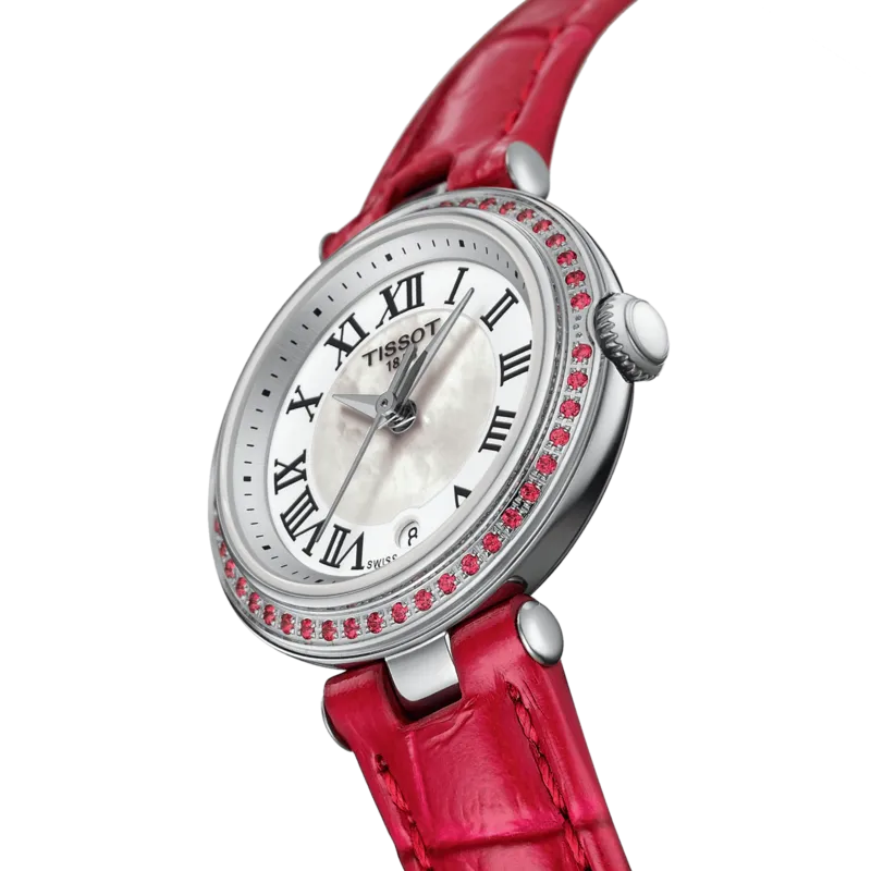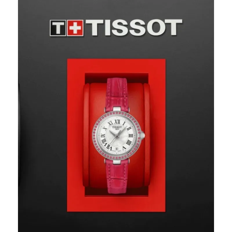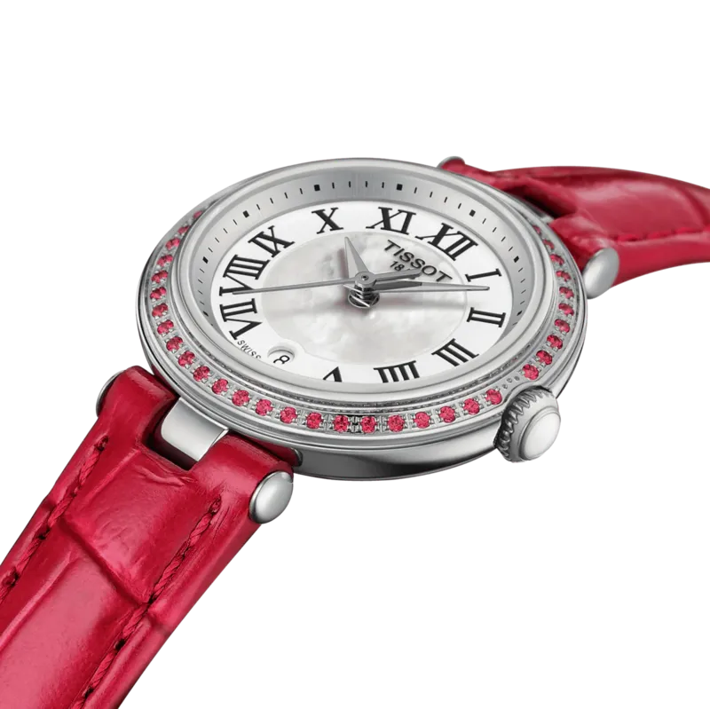 T126.010.66.113.00 שעון מושלם לאישה של טיסו בליסימה | דגם משובץ 47 יהלומים אדומים ברצטעת עור | לוח רומי פנינה | שנתיים אחריות מלאי מוגבל | Tissot T- My Lady Bellissima Ladies Watch White T126010661130