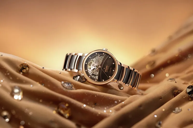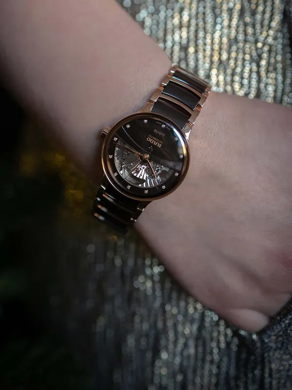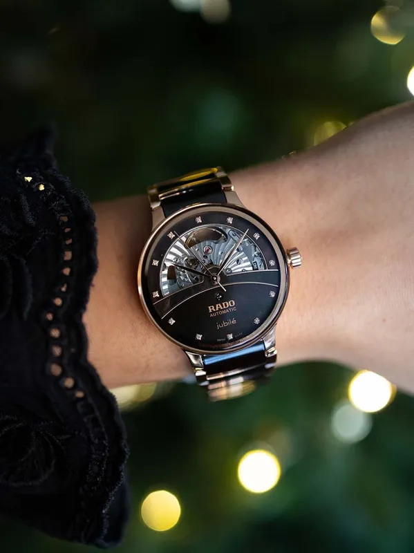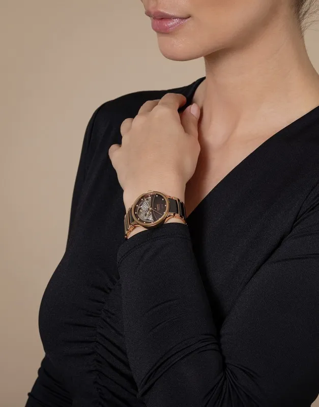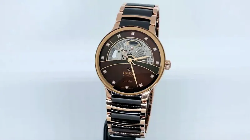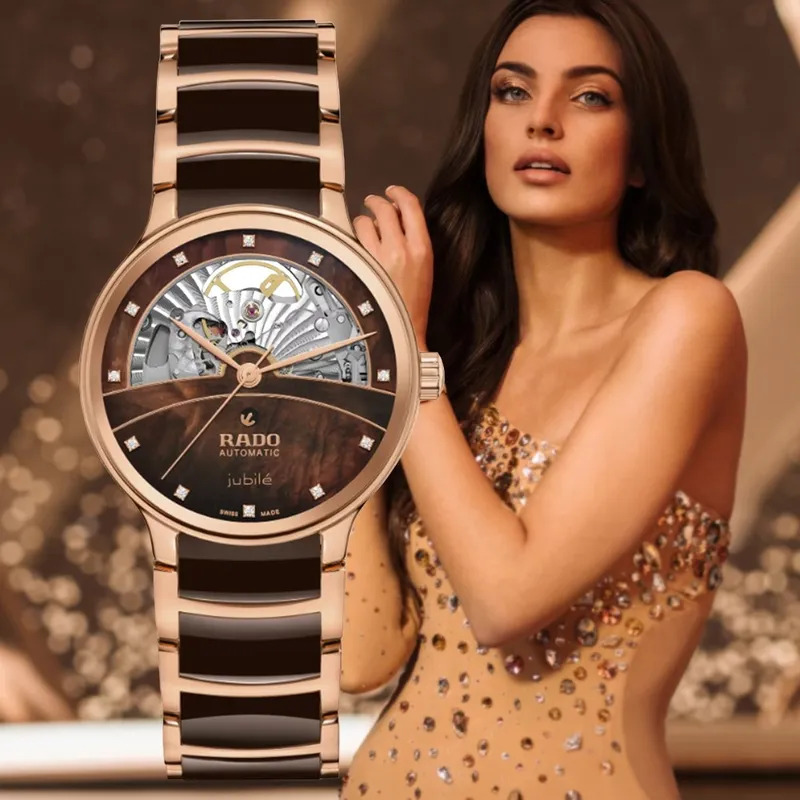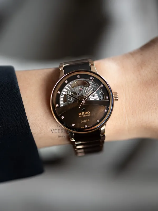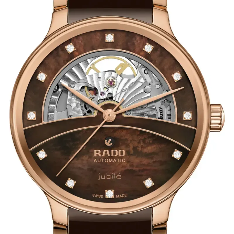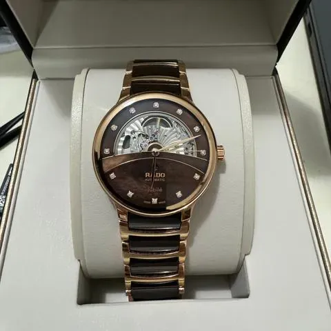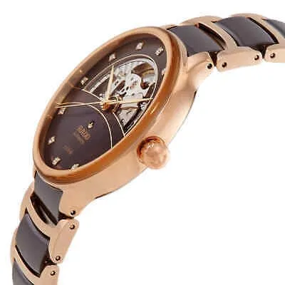 R-60293090 שעון ראדו סנטריקס יבואן רישמי לנשים| דגם חדש לב פתוח בלוח פנינה חום משובץ יהלומים אוטומטי | קרמיקה חומה משולב זהב רוז | 5 שנים אחריות | Rado Centrix Automatic Diamonds Open Heart R30029902