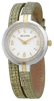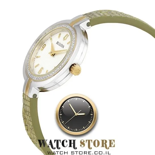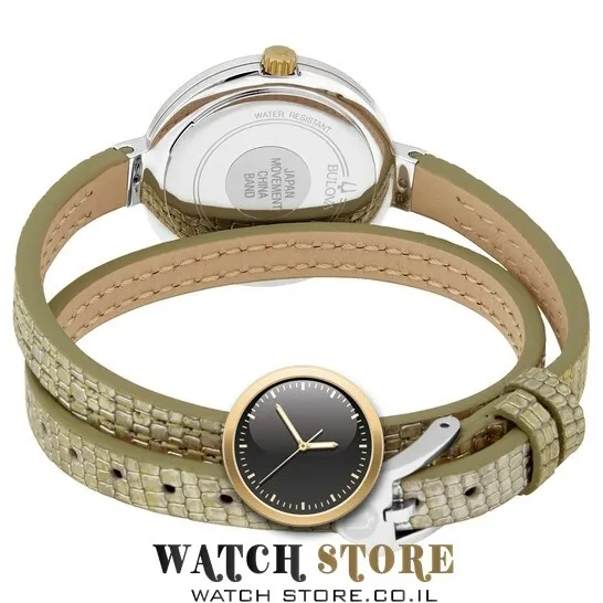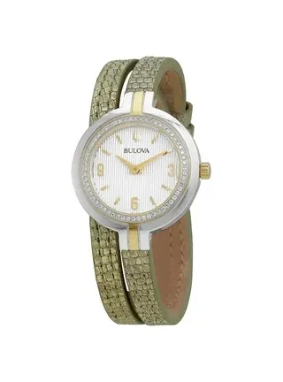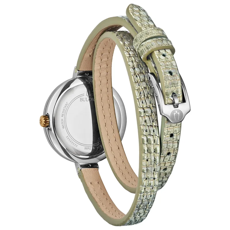 98R278 שעון בולובה לאישה משובץ 52 יהלומים בבאזל | רצועת עור יוקרה כפוךלה מיוחדת | שנתיים אחריות Bulova Women's| Rhapsody Two-Tone Stainless Steel Gray-Green Leather Double Wrap Strap Watch - 98R278