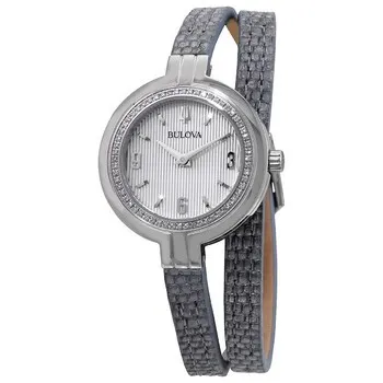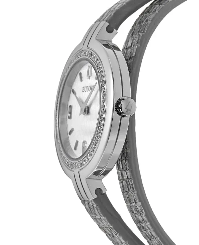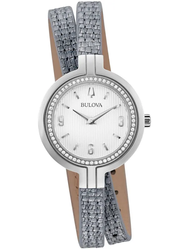 96R236 שעון מיוחד אופנתי יוקרתי לאישה של בולובה | דגם משובץ 52 יהלומים בבאזל | רצועת עור כפולה כחולה /כסופה | שנתיים אחריות | Bulova Women's Rhapsody Diamond Accent Double Wrap Leather 96R236