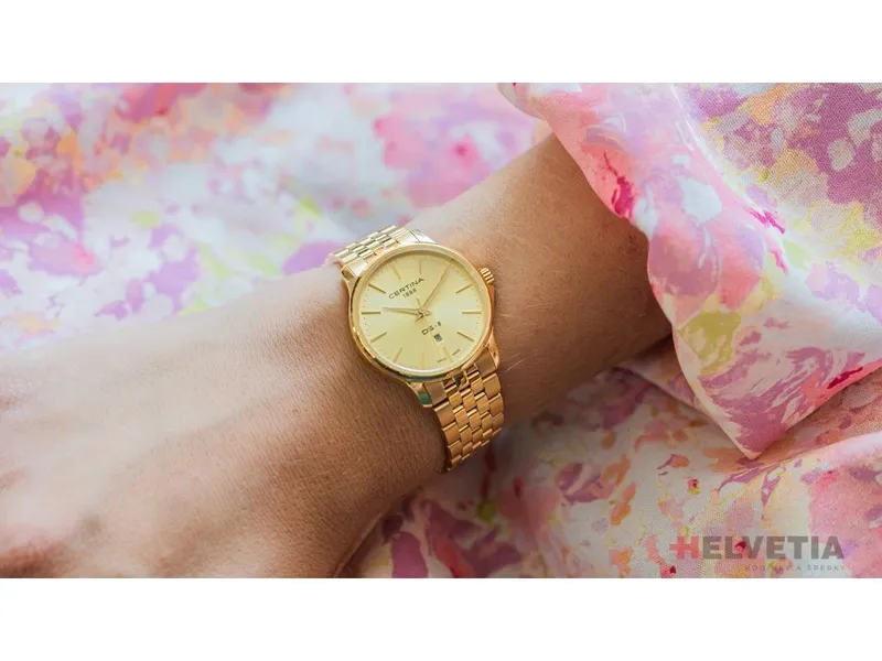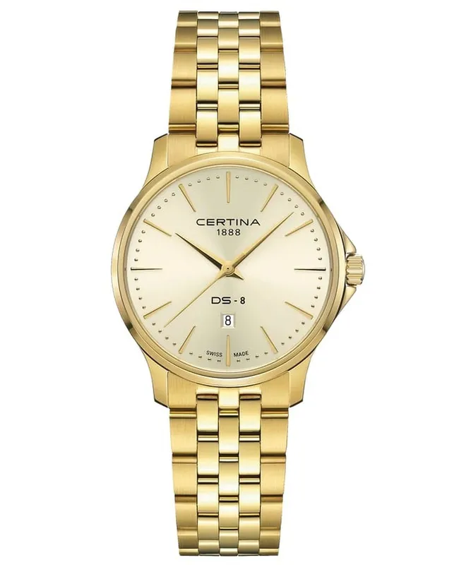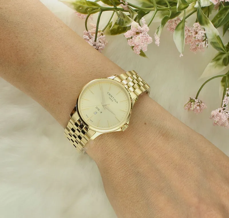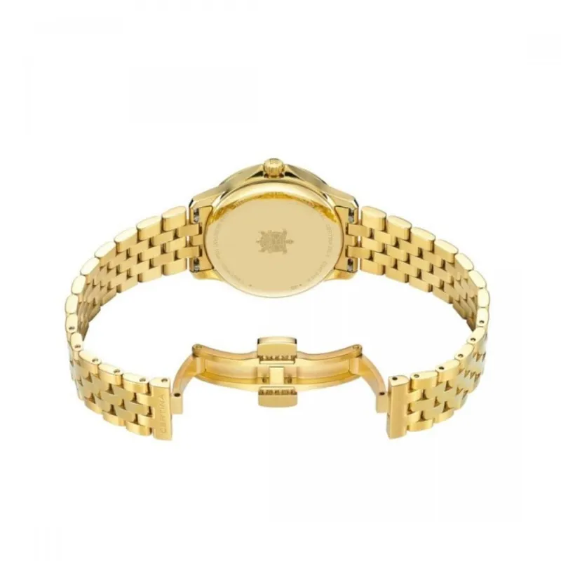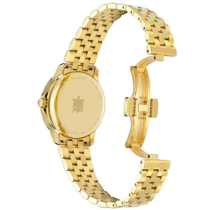 C045.010.33.361.00 שעון זהב לאישה של סרטינה שוויץ מסדרת די אס 8 החדשה | לוח זהב | 5 שנים אחריות יבואן רשמי | CERTINA DS-8 31mm Ladies Watch C0450103336100