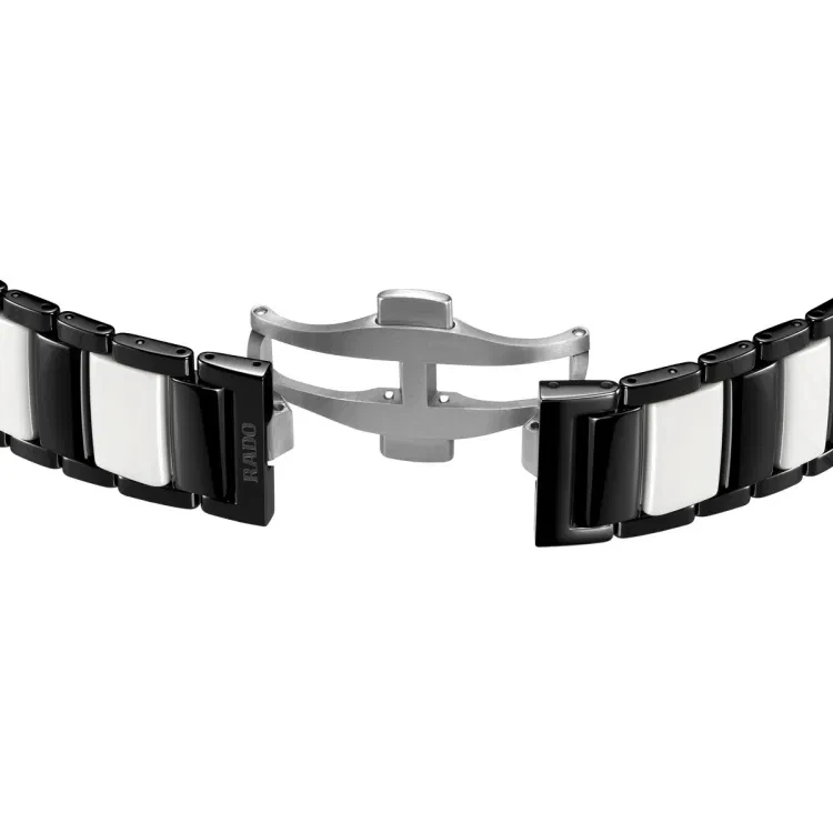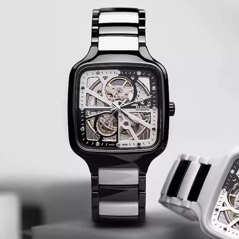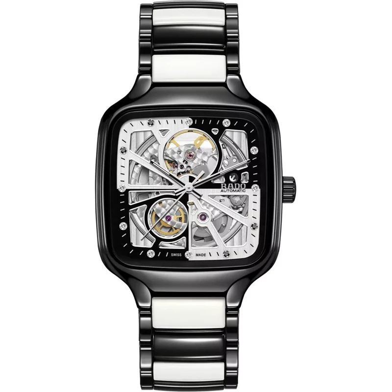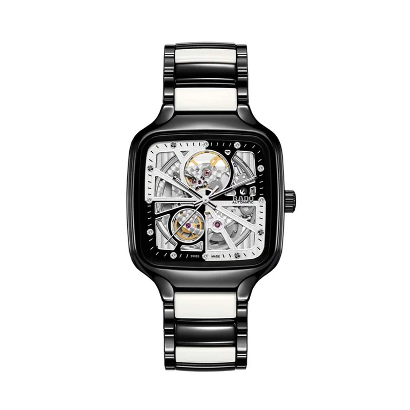 R-60863075 שעון ראדו יבואן רשמי מסדרת טרו דמקה | דגם מהדורה מוגבלת | מנגנון אוטומטי עם 12 יהלומים | קרמיקה שחורה ולבנה | Rado True Square 12 Diamonds Limited Edition R27086752
