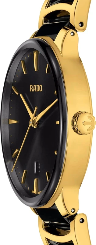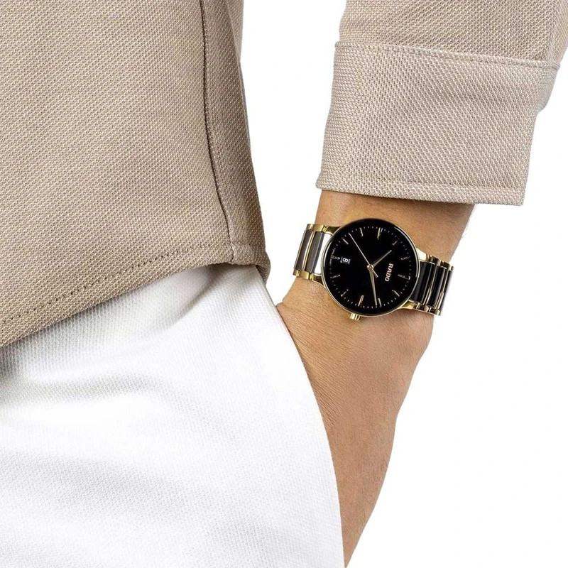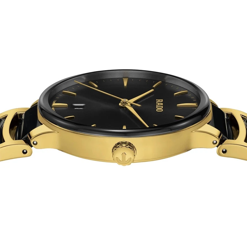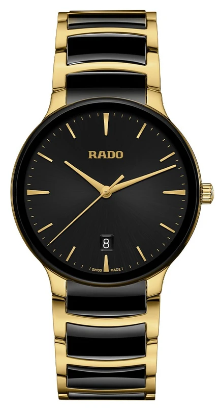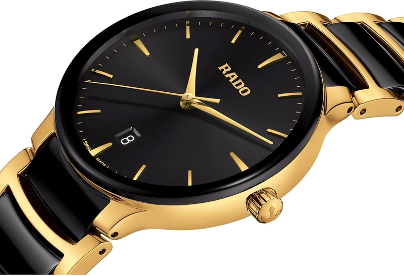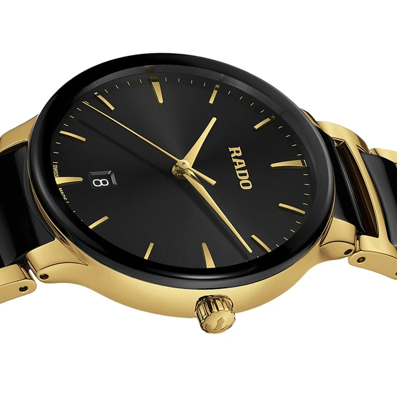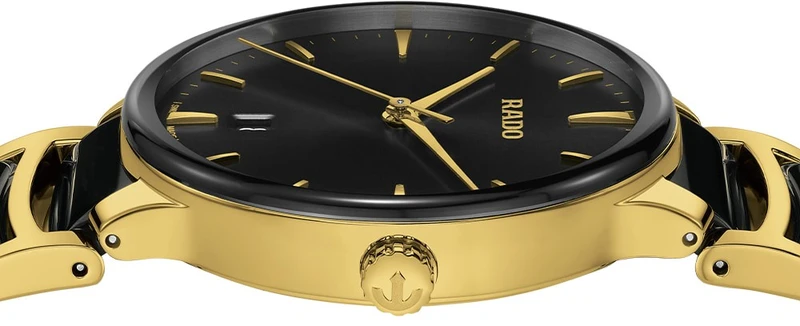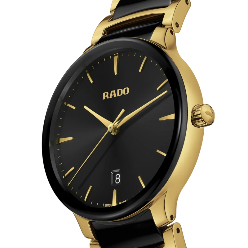 R-60223015 שעון ראדו יבואן רשמי | דגם מדרת סנטריקס החדשה | רצועה קרמית משולבת זהב | לוח שחור פסים | 5 שנים אחריות | שעוני RADO בראשון לציון | Rado Centrix unisex watch Rado Centrix R30022152