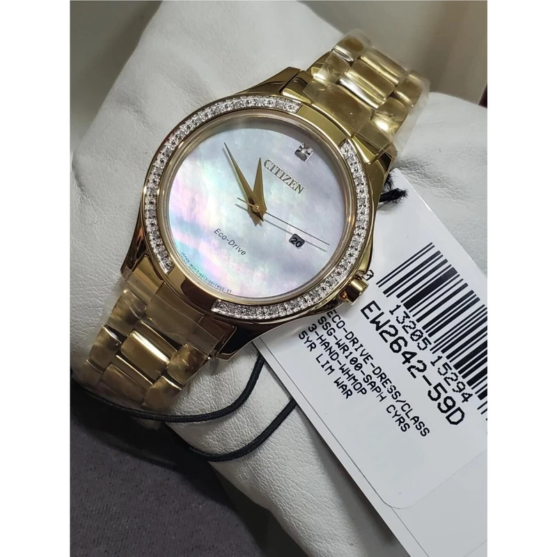 EW2642-59D שעון סיטיזן אקו דרייב משובץ יהלומים לאישה | לוח לבן פנינה מהמם כולל תאריכון | טעינה סולארית | שנתיים אחריות | Citizen Eco-Drive Women's Gold Diamond Accents Calendar Watch 32MM EW2642-59D
