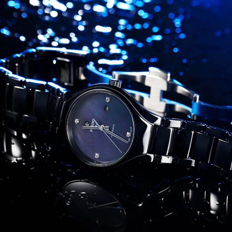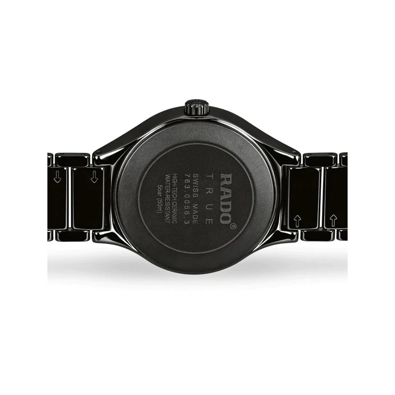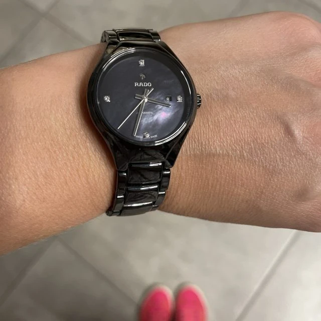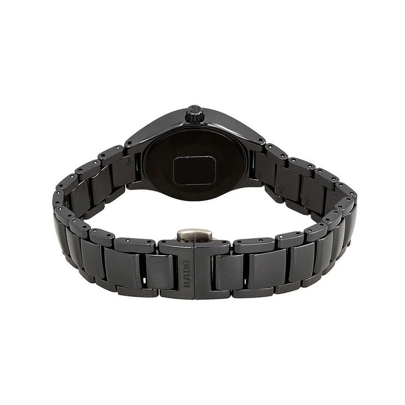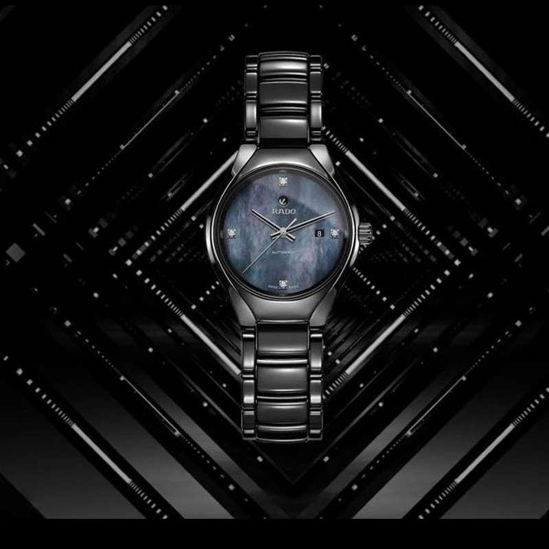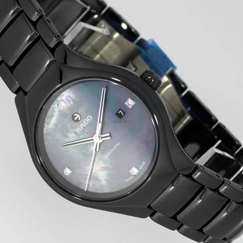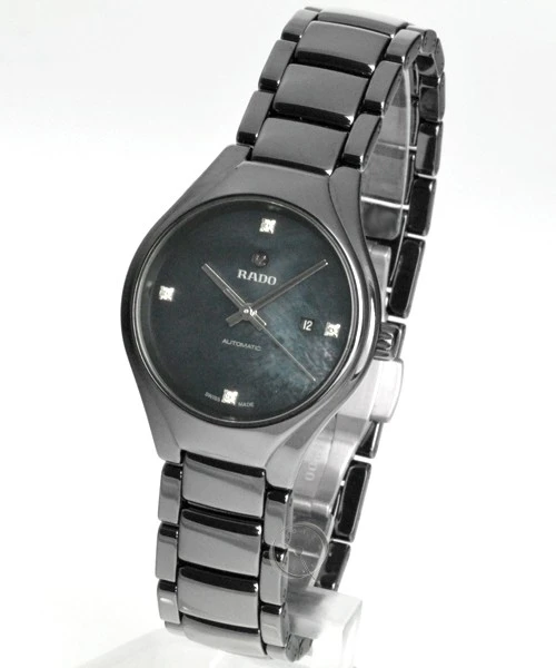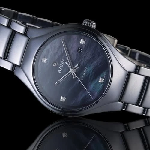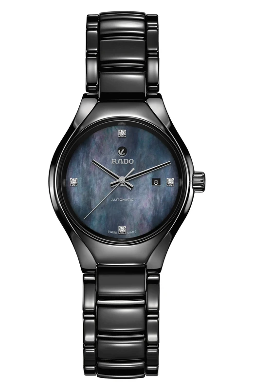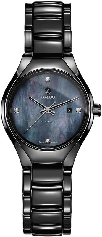 R-02423087 שעון RADO דגם אוטומטי לאישה יבואן רשמי | לוח פנינה שחור כחול מיוחד משובץ 4 יהלומים | 5 שנים אחריות | Rado True Automatic Diamond Ladies Watch R27242872