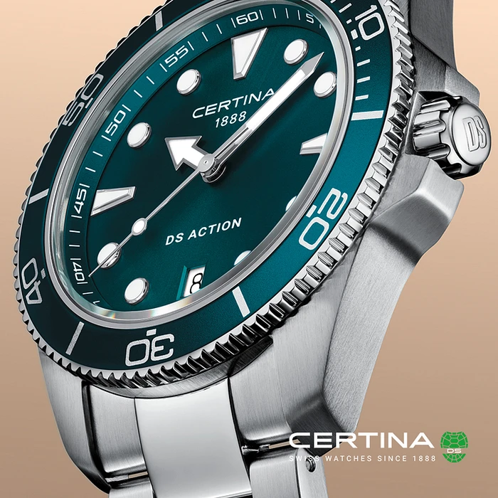 C048.410.11.091.00 שעון חדש 2025 של סרטינה דגם 40 מ''מ מסדרת אקשן | לוח ירוק זרחני מיוחד | 5 שנים אחריות יבואן רשמי | Certina DS Action Gent Quartz C0484101109100