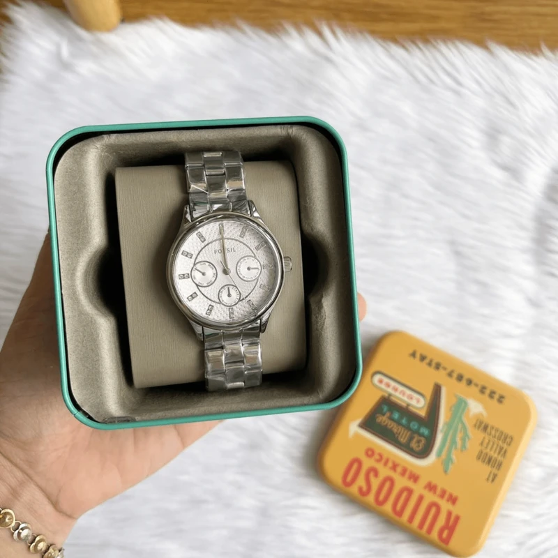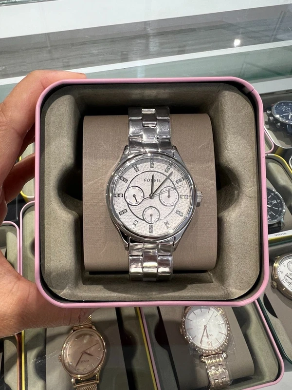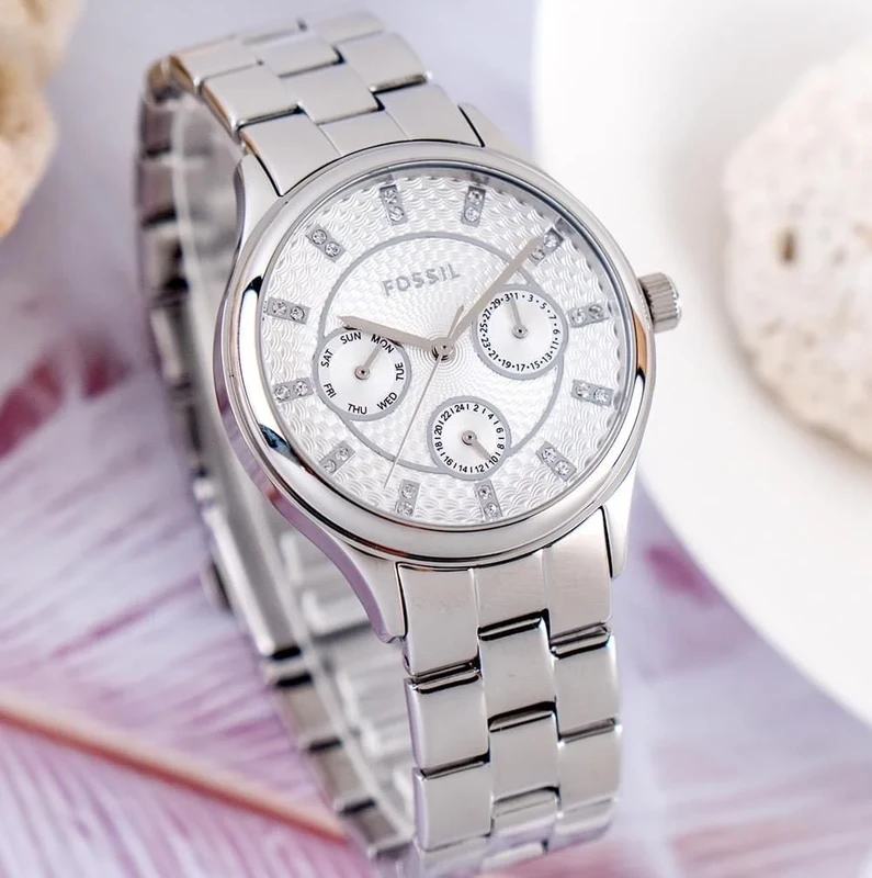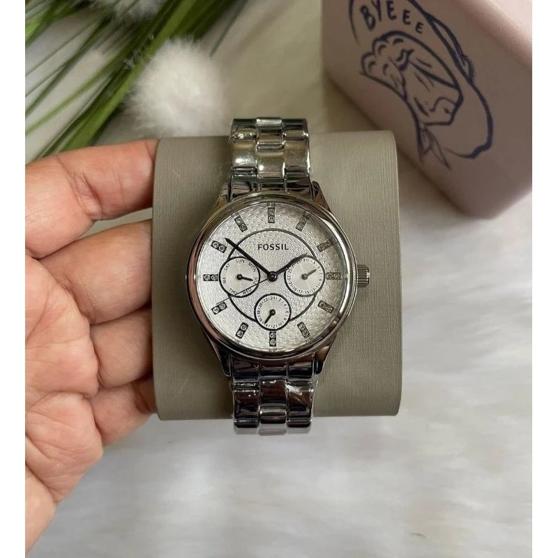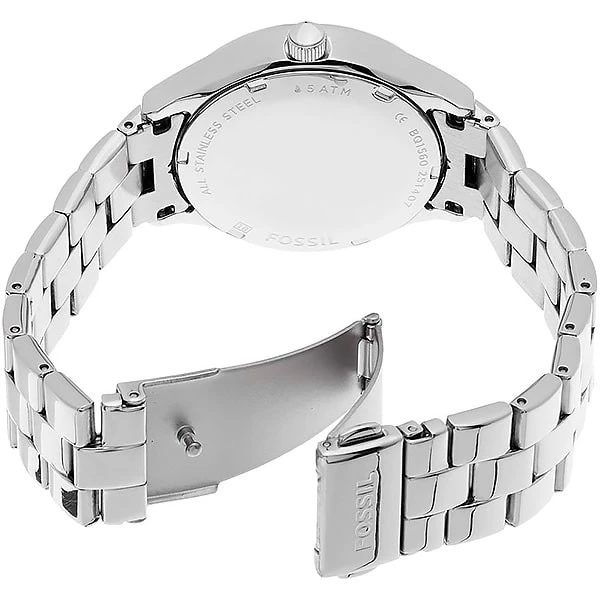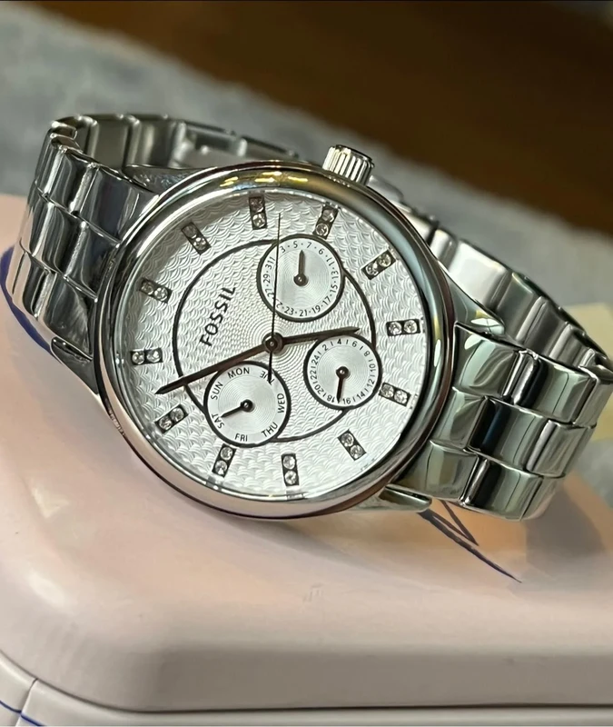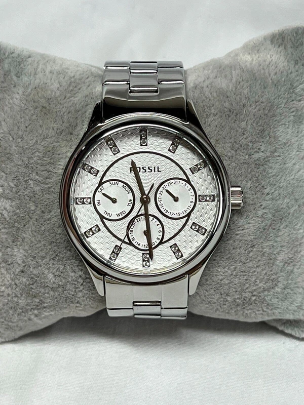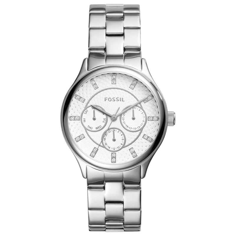 BQ1560 שעון יד פוסיל לאישה בלוח לבן מיוחד משובץ | שעון אופנתי איכותי כולל תאריכון ימים שנתיים אחריות | Fossil Modern Sophisticate Silver Watch BQ1560