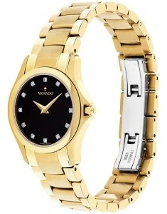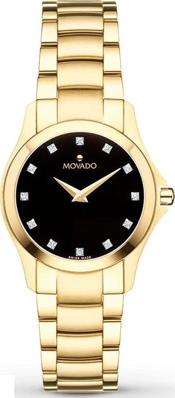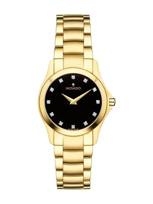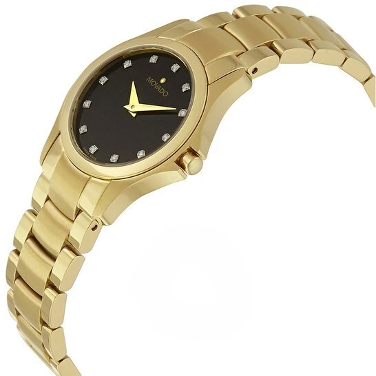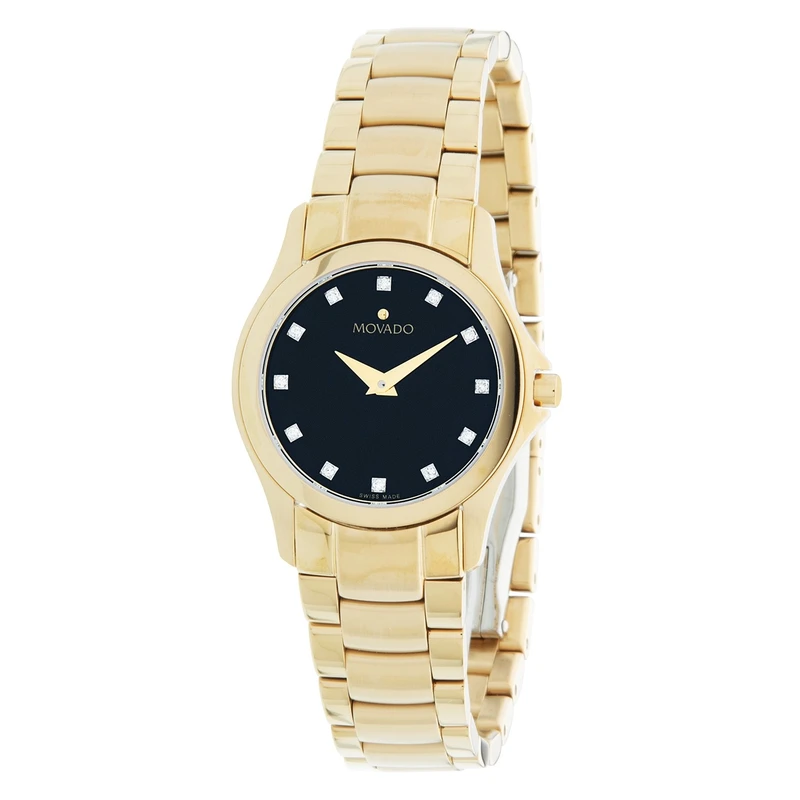 0607028 שעון יוקרה של מובאדו לאישה | דגם זהב בלוח שחור מושלם משובץ 12 יהלומים | מלאי מוגבל כולל שנתיים אחריות יבואן רשמי | Movado 0607028 Women's Collection Black Quartz Watch