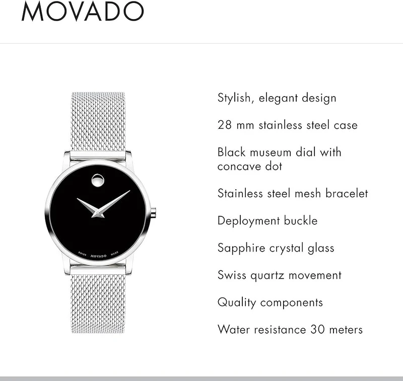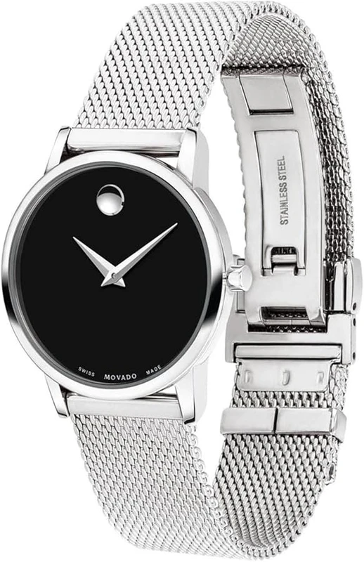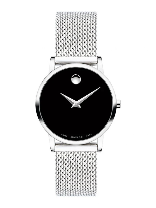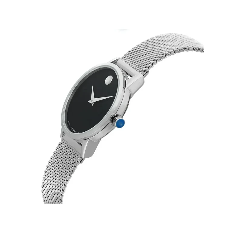 0607220 שעון מובאדו מוזיאון קלאסי לאישה | דגם כסוף ברצועת רשת אופנתית | לוח שחור זכוכית ספיר | שעוני יוקרה שווצריים לנשים | שנתיים אחריות יבואן רשמי | Movado Women's Museum Black Dial Stainless 060722