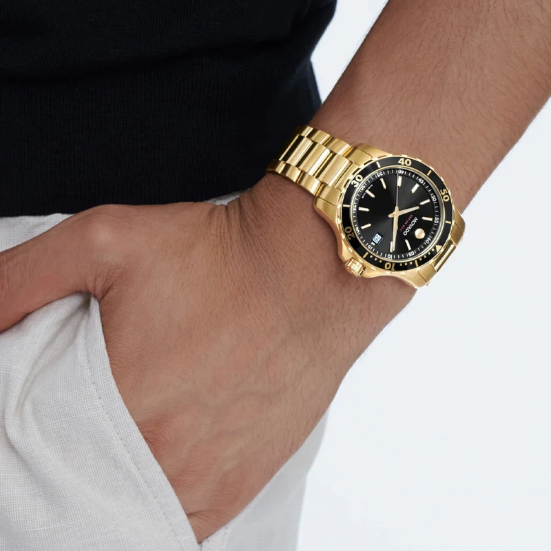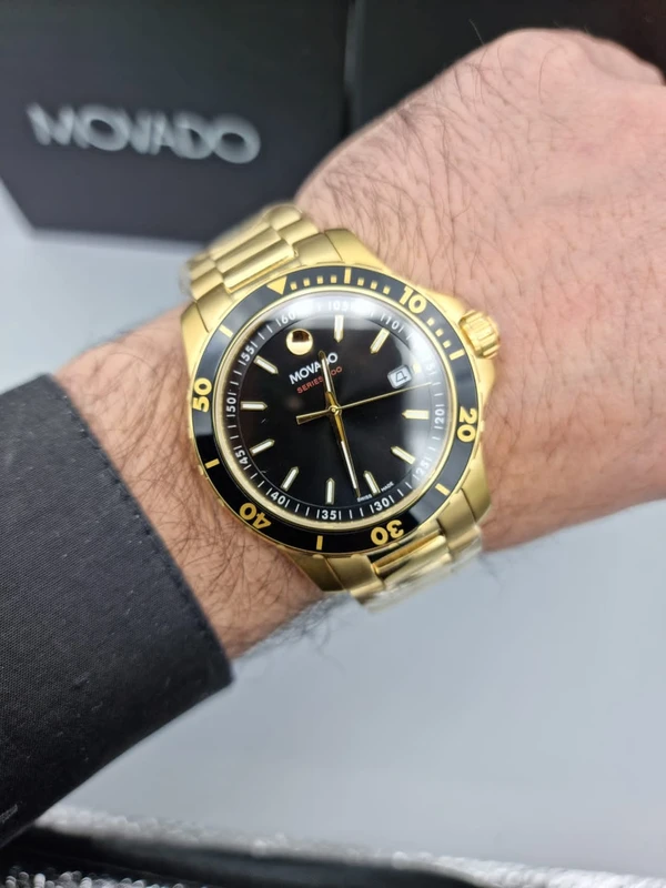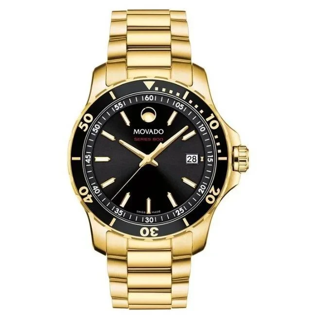 2600145 שעון ספורטיבי אלגנטי של מובאדו לגברים מסדרת 800 | שעון זהב בלוח שחור 200 מטר | שעון יוקרתי שווצרי כולל אחריות יבואן רשמי | Movado Series 800 Black Dial Yellow Gold Tone Men's Watch 2600145