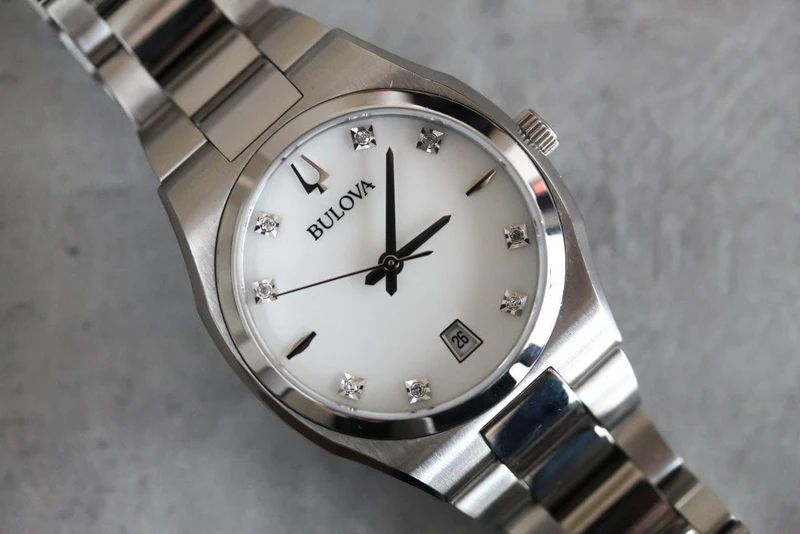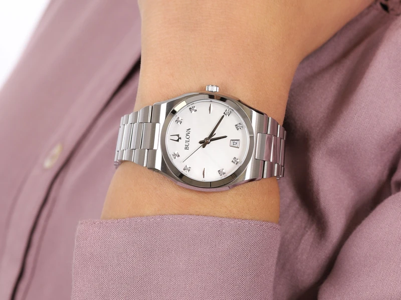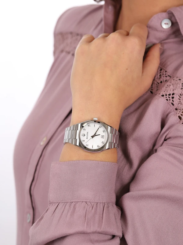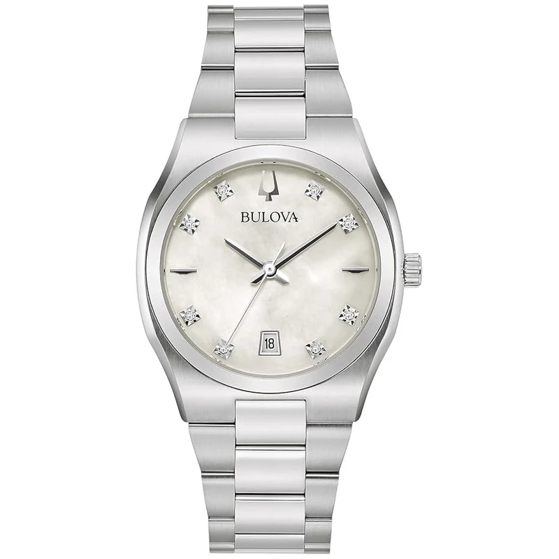 96P218 שעון יד בולבה לאישה | דגם חדש בלוח פנינה משובץ 8 יהלומים | שעון אלגנטי יוקרתי כולל שנתיים אחריות | מלאי מוגבל | Bulova Women's Surveyor Stainless Steel Diamond Dial 96P218