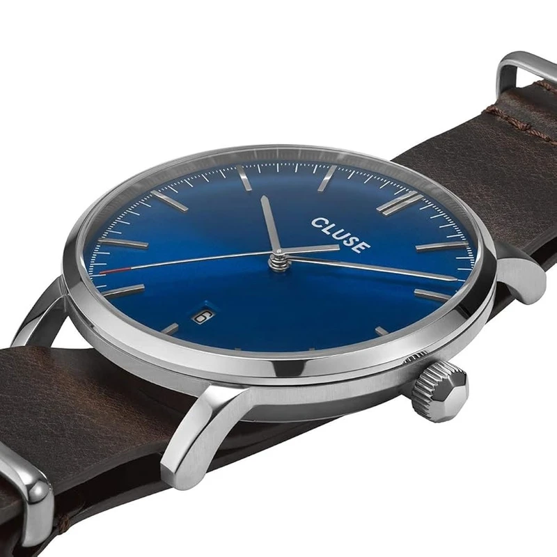 CW0101501008 שעון קלוז לגברים ברצועת עור חומה | דגם כסוף בלוח כחול מרשים | שעון אלגנטי איכותי כולל שנתיים אחריות יבואן רשמי | CLUSE Men Analogue Quartz Watch with Leather Strap CW0101501008