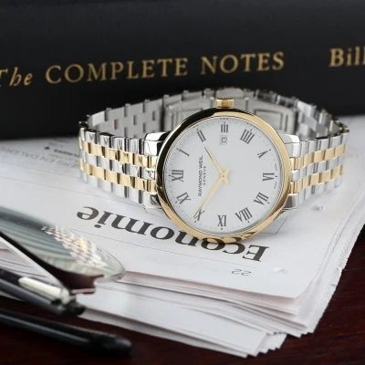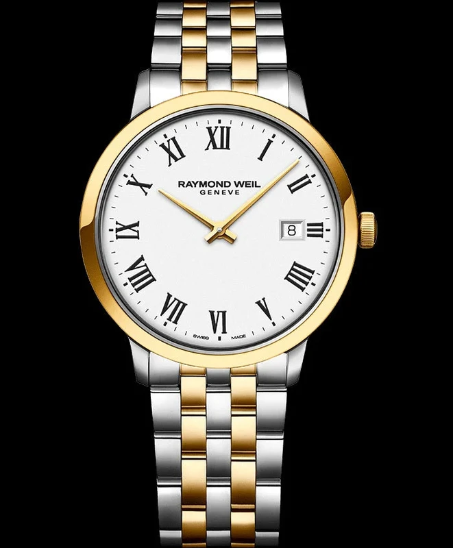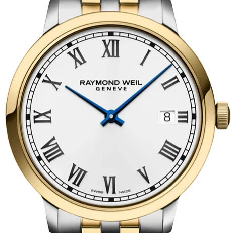 5485-STP-00300 שעון יד ריימונד ווייל לגברים | דגם טוטון בלוח לבן רומי | שעון יוקרתי שווצרי כולל שנתיים אחריות יבואן רשמי | Raymond Weil Toccata Quartz Two Tone Steel 39mm Watch 5485-STP-00300