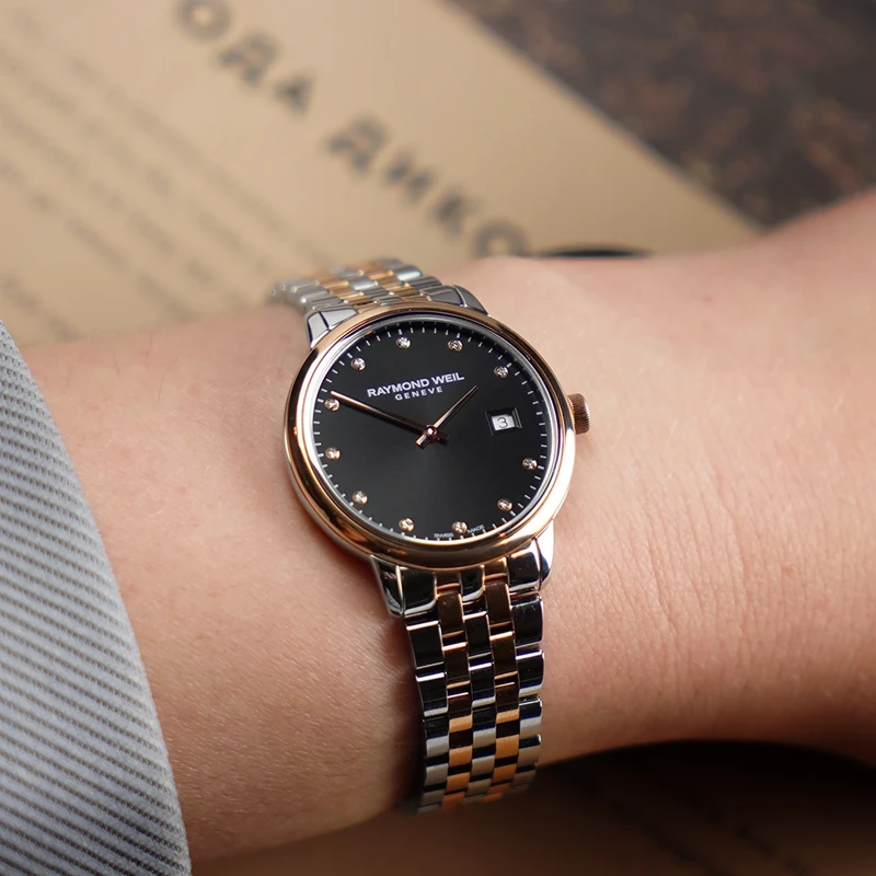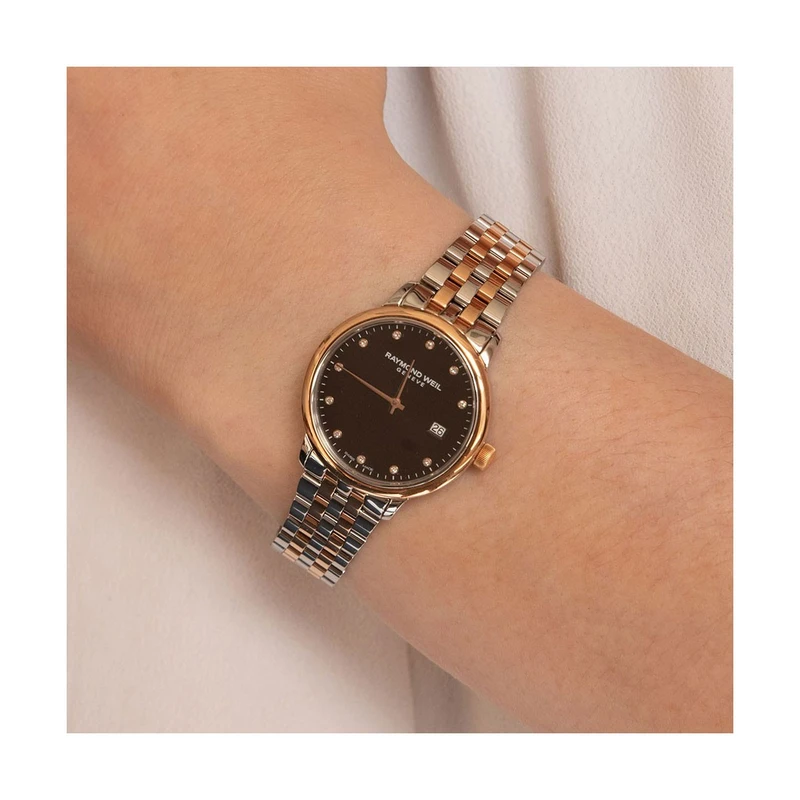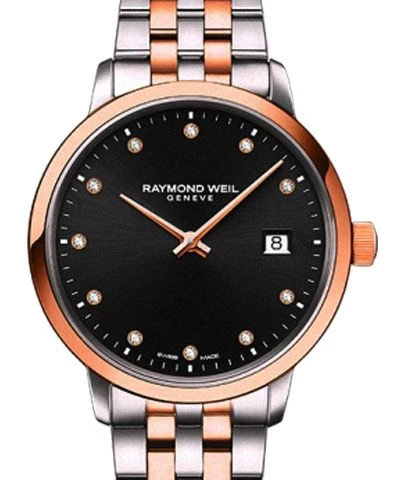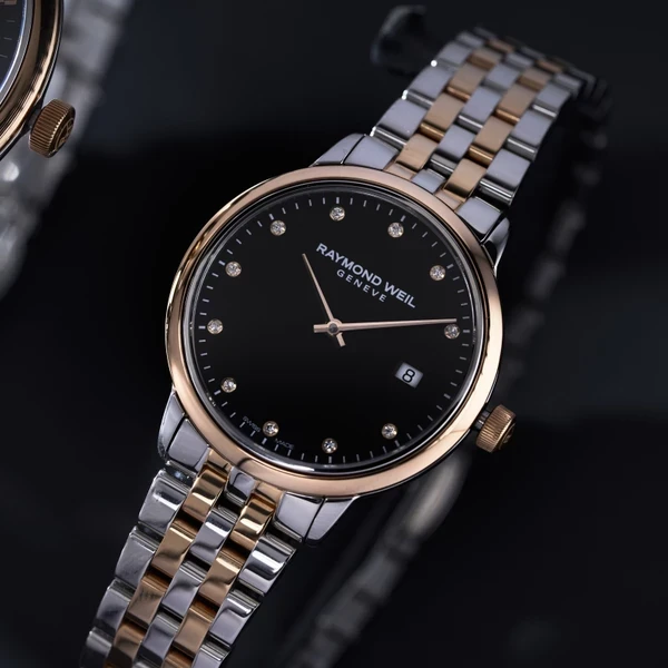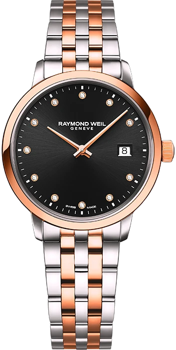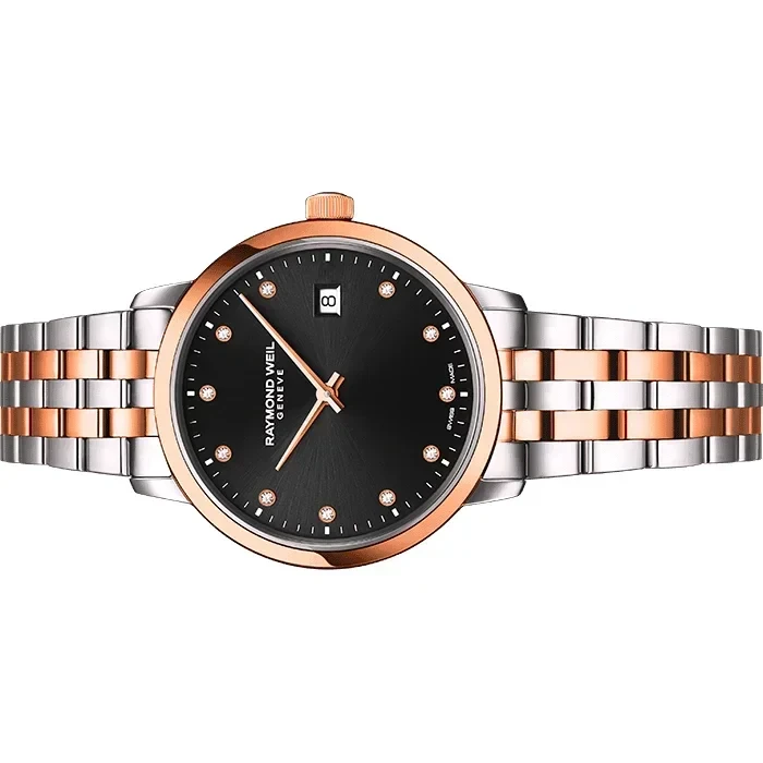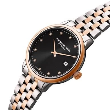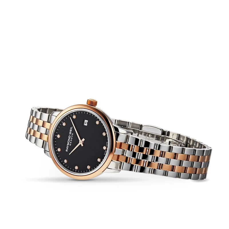 5985-SP5-20081 שעון ריימונד ווייל לנשים טוטון רוז גולד לוח שחור משובץ 11 יהלומים | שנתיים אחריות יבואן רשמי | Raymond Weil Toccata Ladies Two-tone Rose Gold 11 Diamond Quartz Watch 29mm 5985-SP5-20081