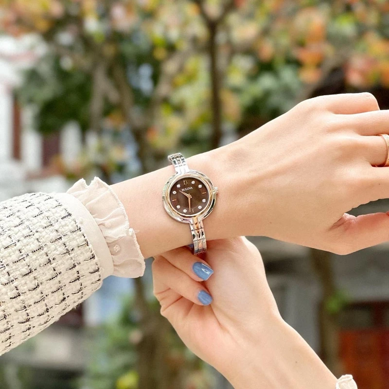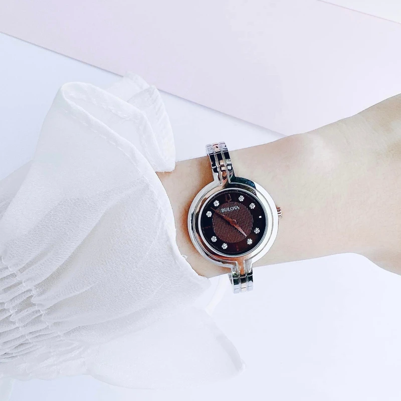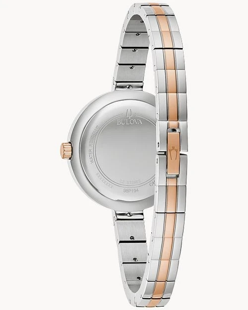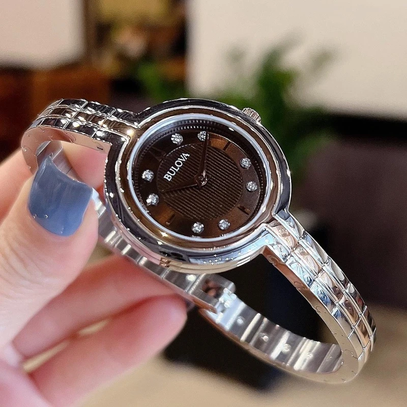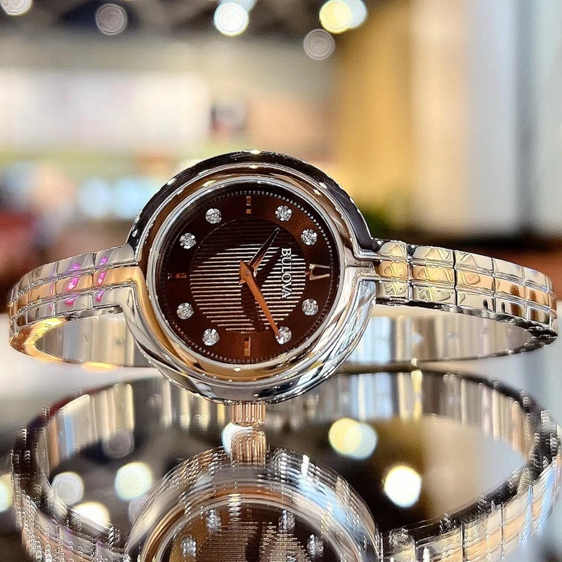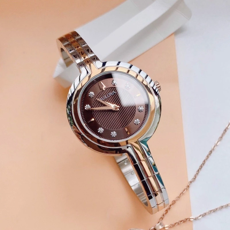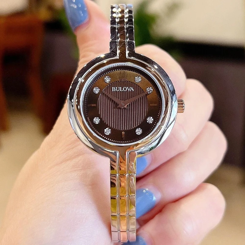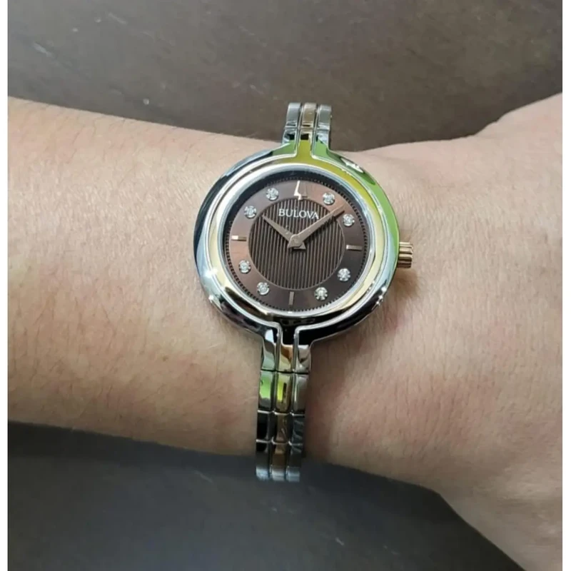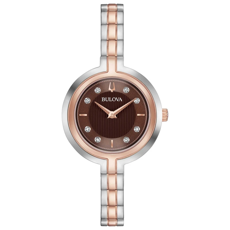 98P194 שעון בולובה לאישה | דגם צמיד רוז גולד בלוח חום משובץ 8 יהלומים | מנגנון יפני איכותי כולל שנתיים אחריות | Bulova Women's Classic Rhapsody Quartz Dial Watch 98P194