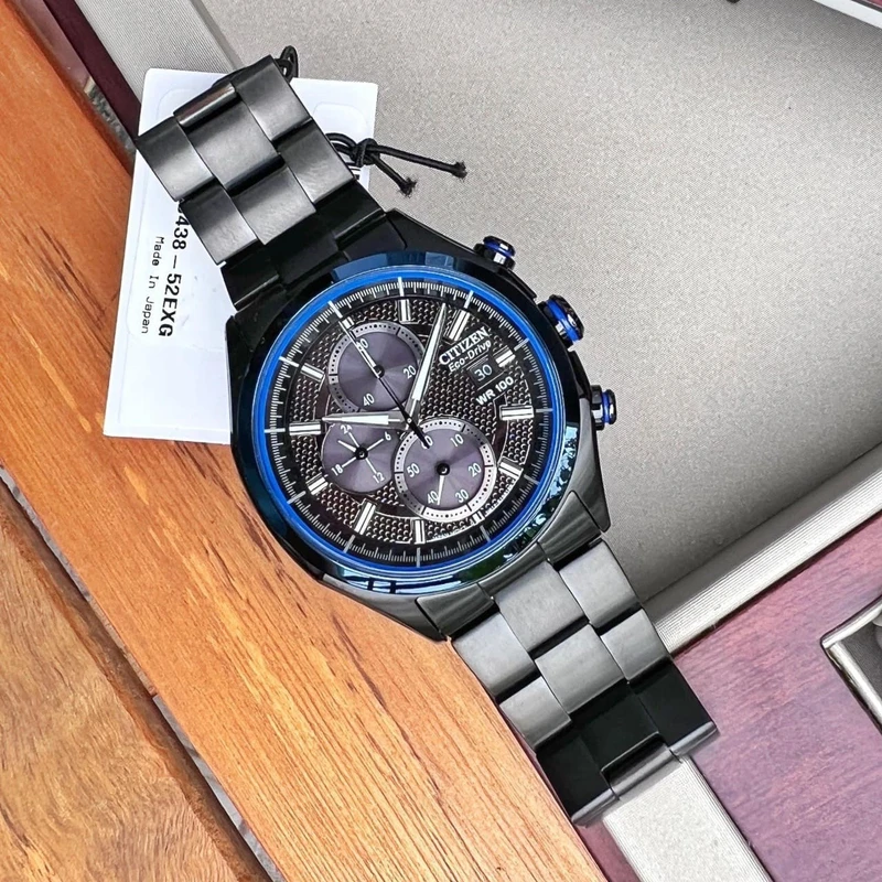 CA0438-52E שעון יד סיטיזן לגברים | דגם שחור באזל כחול כרונוגרף | דגם אקו דרייב סולארי | לוח מהמם כולל תאריכון | שנתיים אחריות | Citizen Eco-Drive Weekender Black Dial Stainless Steel Men's CA0438-52E
