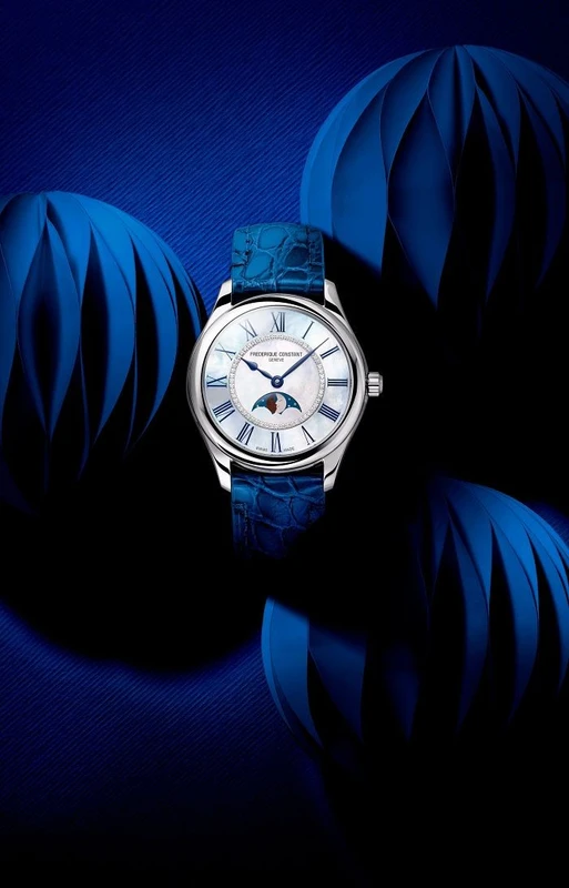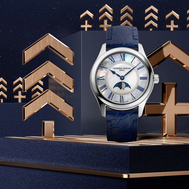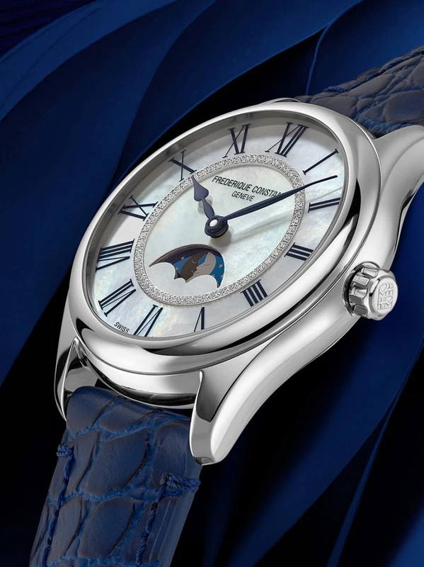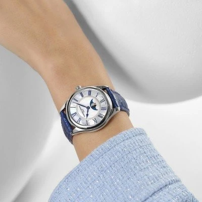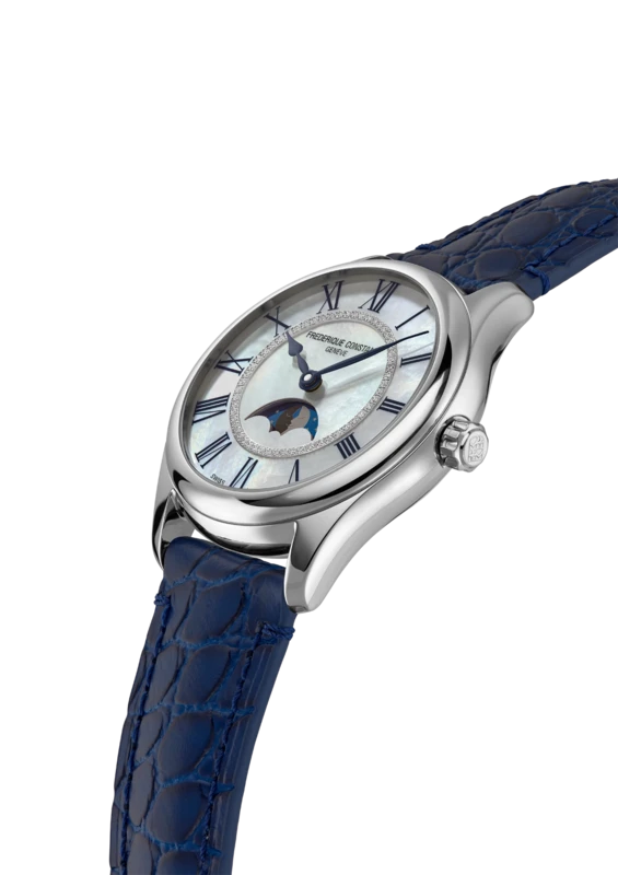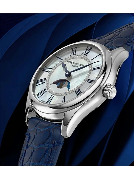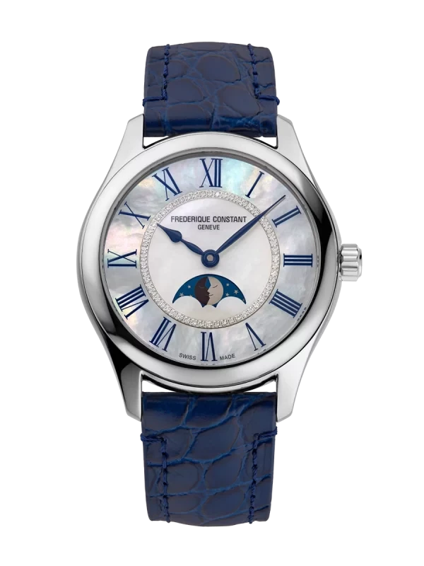 FC-331MPWND3B6 שעון פרדריק קונסטנט לנשים מהמם בלוח כחול פנינה משובץ יהלומים | תצוגת ירח | רצועת עור כחולה עם שנתיים אחריות יבואן רשמי | Frederique Constant Classics Ladies Luna Automatic FC-331MPWND3