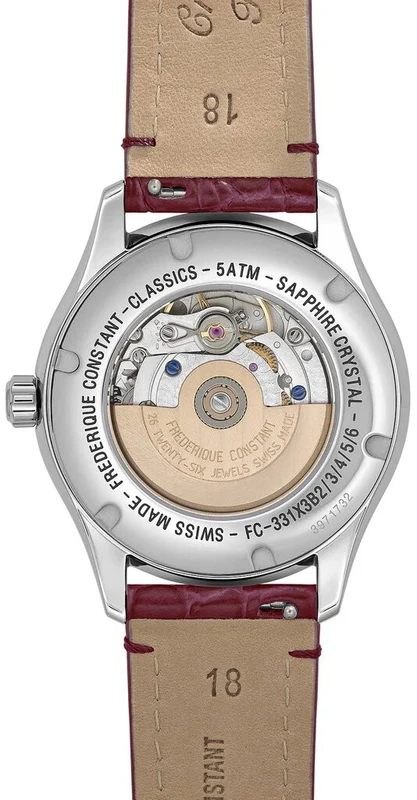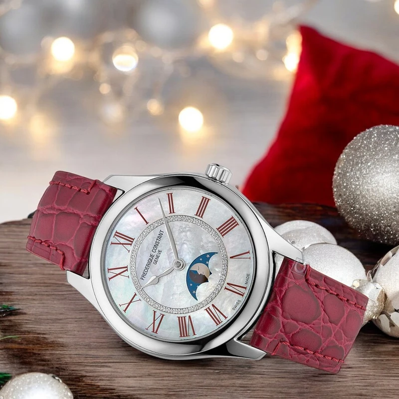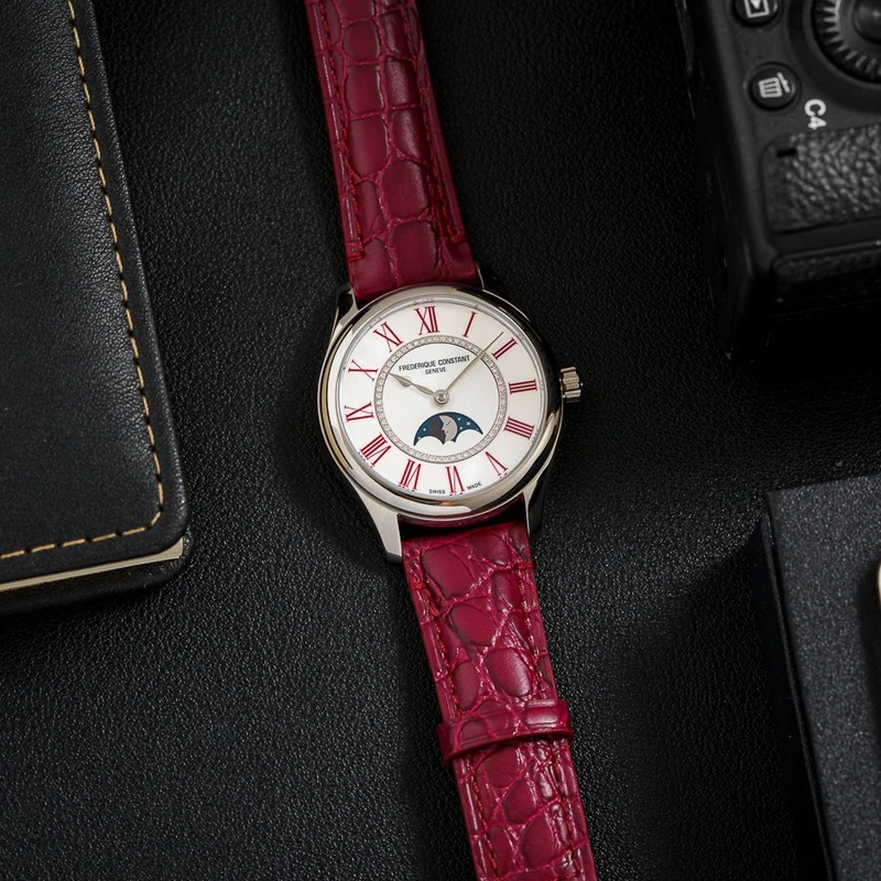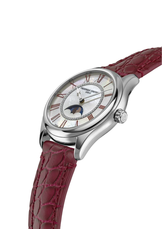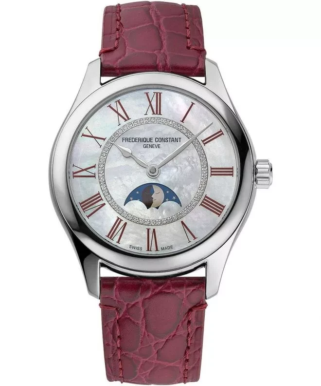 FC-331MPWRD3B6 שעון יוקרה לאישה של פרדריק קונסטנט | דגם אוטומטי בלוח פנינה משובץ יהלומים | רצועת עור אדומה כולל שנתיים אחריות יבואן רשמי | FREDERIQUE CONSTANT Classics Elegance Luna FC-331MPWRD3B6