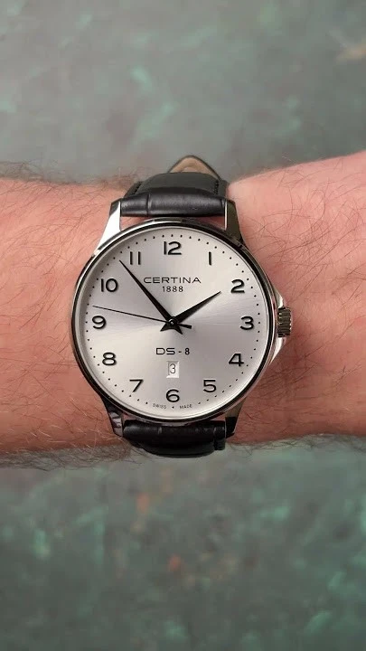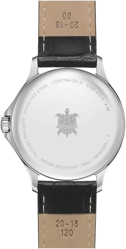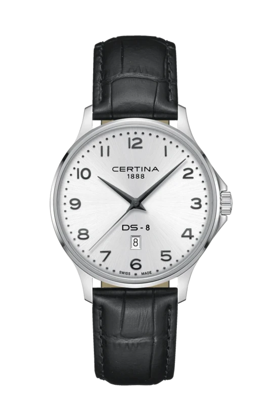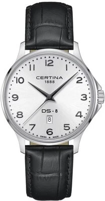 C045.410.16.032.00 שעון סרטינה דגם חדש לגברים די אס 8 | דגם אלגנטי בלוח כסוף מספרים כולל תאריכון | רצועת עור שחורה | 5 שנים אחריות יבואן רשמי | Certina DS-8 Gent 40 mm C0454101603200