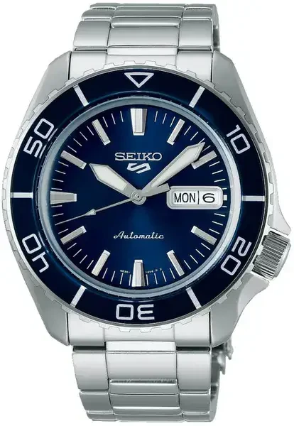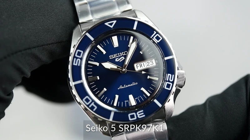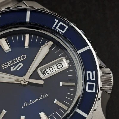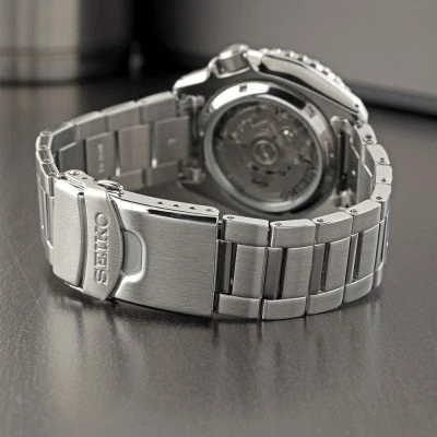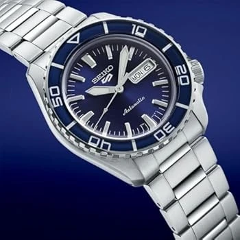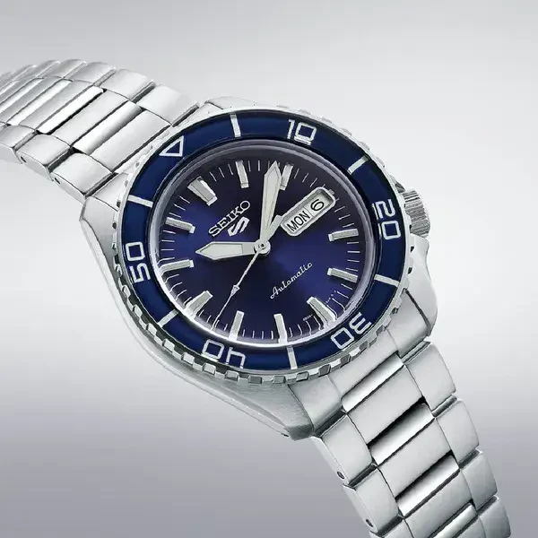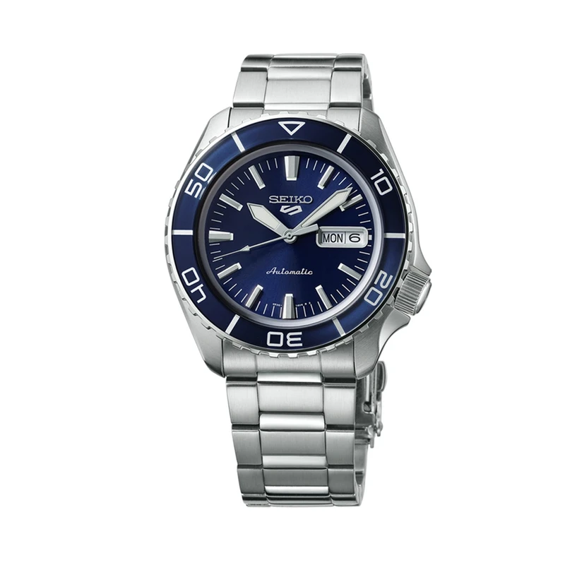 SRPK97 שעון סייקו 5 יבואן רשמי | דגם אוטומטי עם לוח ובאזל כחולים | חלון אחורי שקוף | 100 מטר כתר תחתון | לוח זרחני | Seiko 5 Automatic Blue Dial Steel Bracelet Men's Watch SRPK97K15