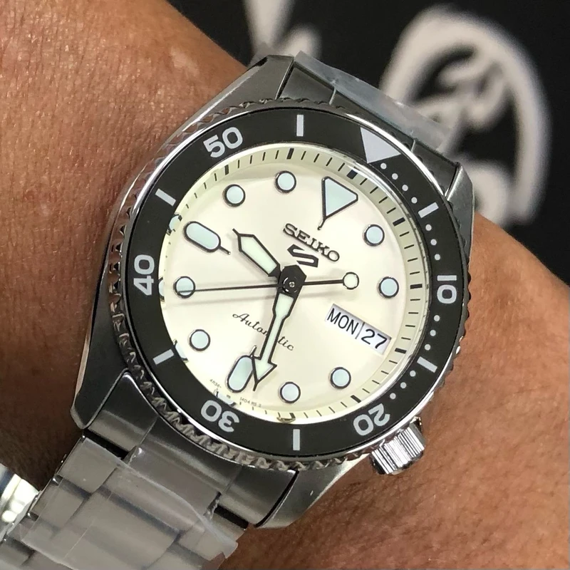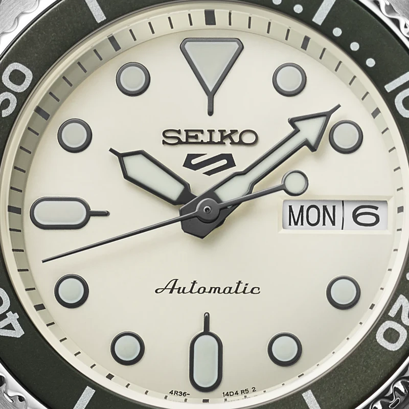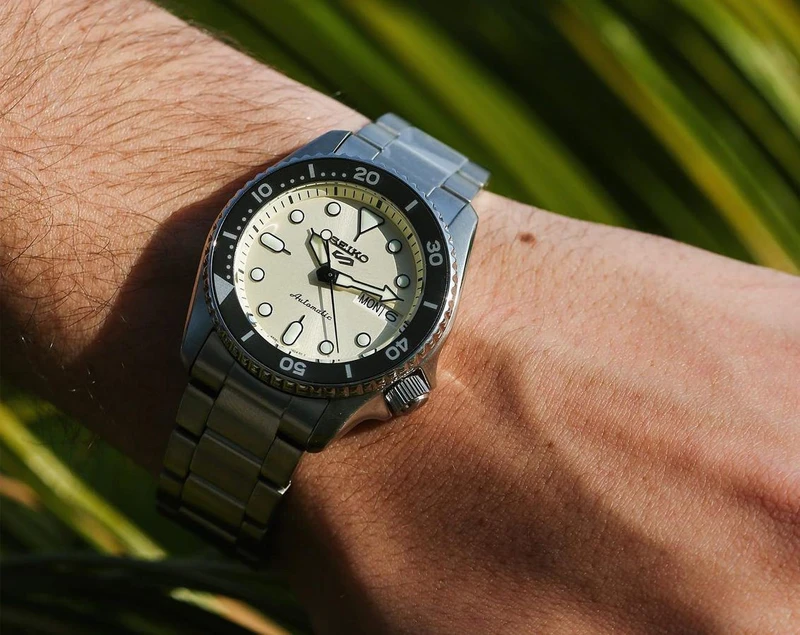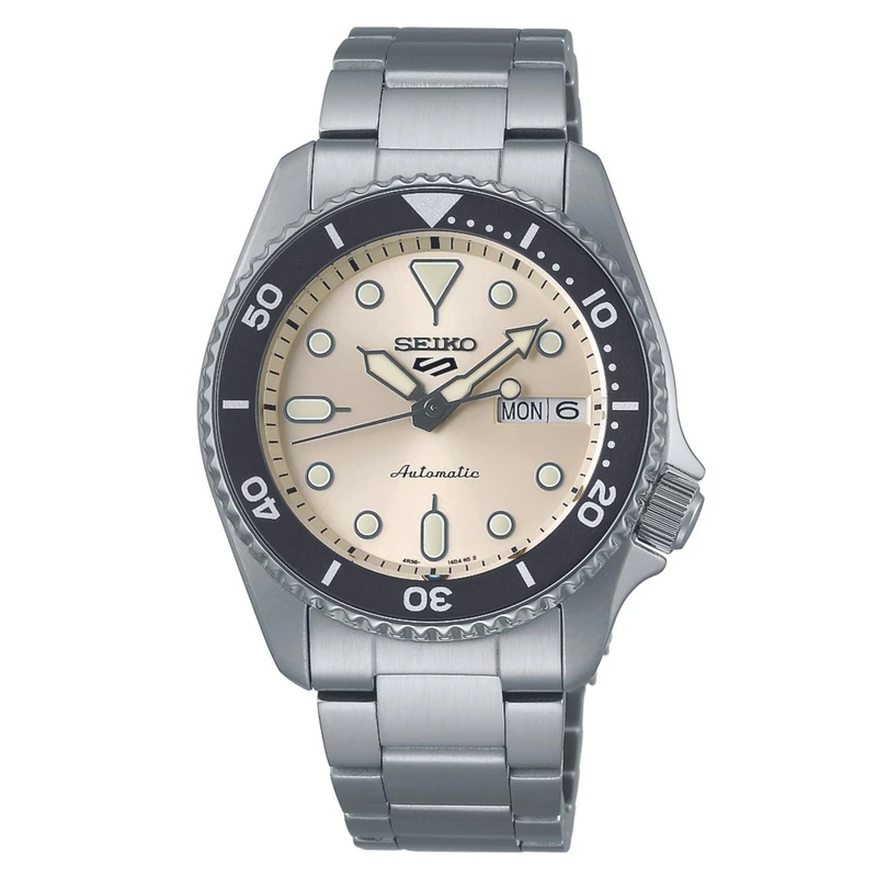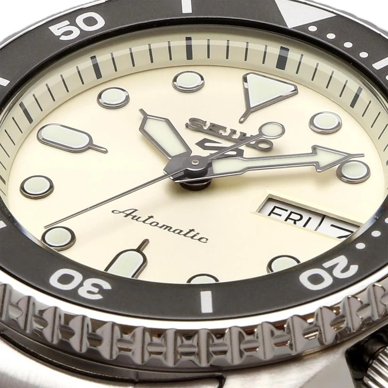 שעון 5 Seiko Sports יוניסקס מסדרת ה SKX Sports Style האהובה. לוח השעון בצבע בז'-שמנת