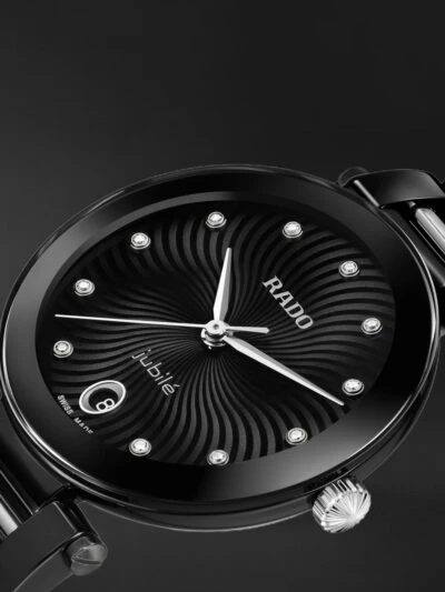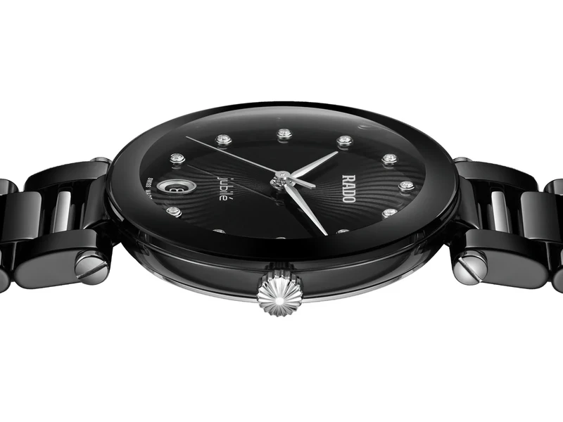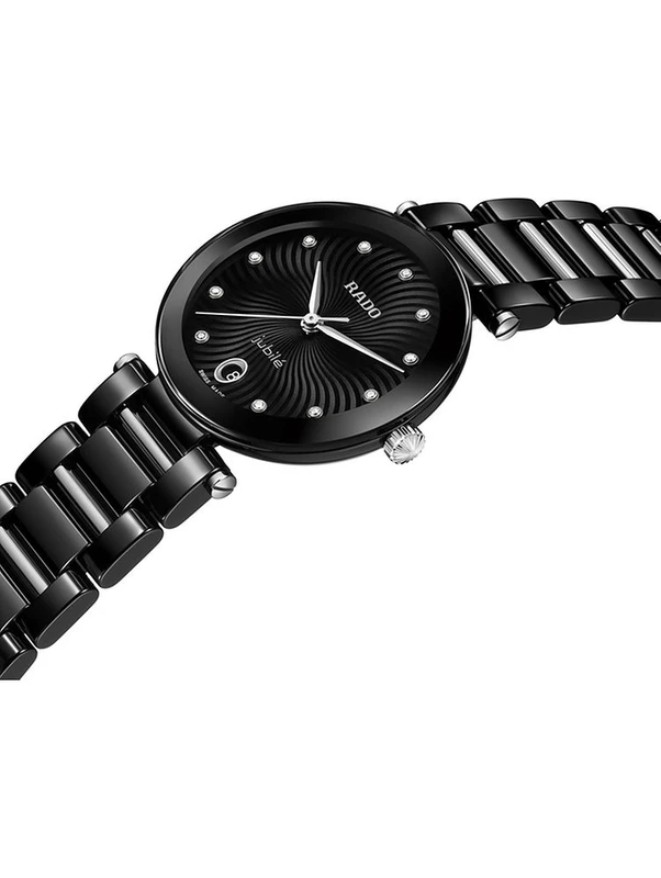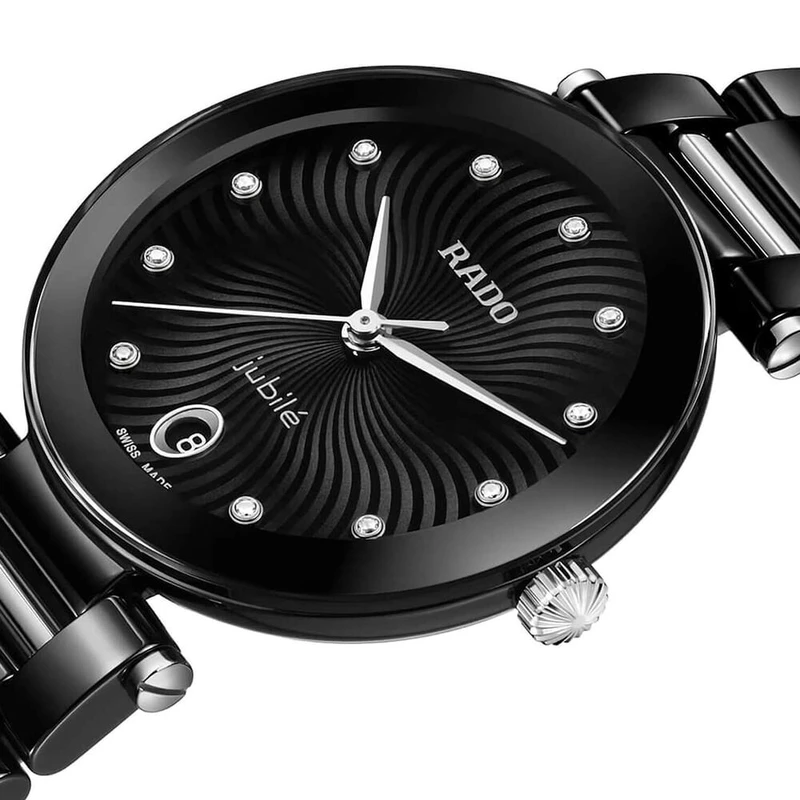R-62433070 | R22243703 ראדו יבואן רשמי מסדרת לה קופל החדשה | דגם קרמי בלוח שחור גלים מהפנט משובץ 11 יהלומים | רצועה שחורה עם כסף מלאי מוגבל בישראל | Rado LaCoupole Diamonds 31mm Ladies Watch R22243703