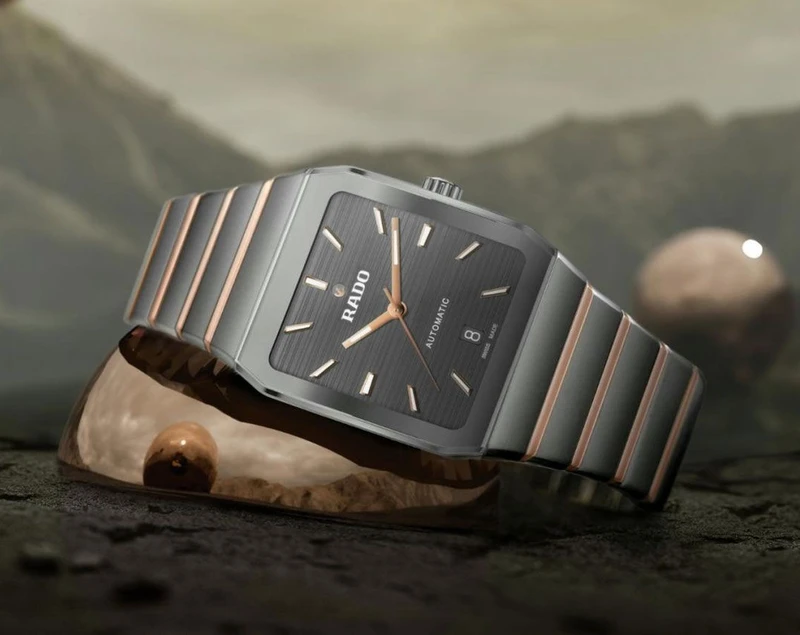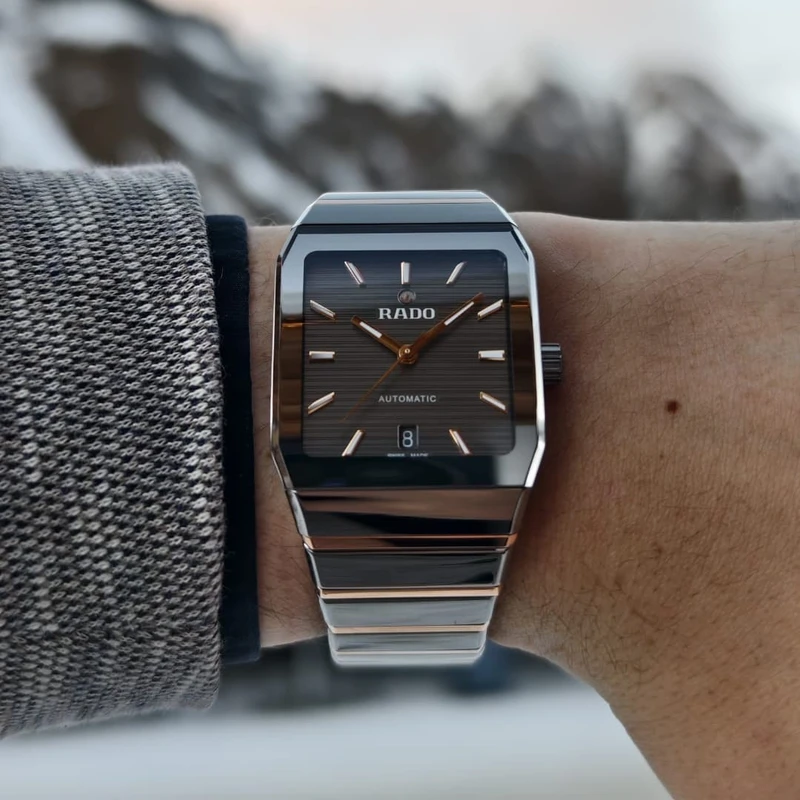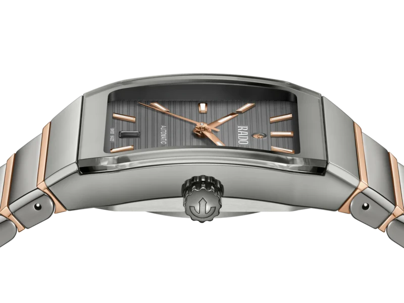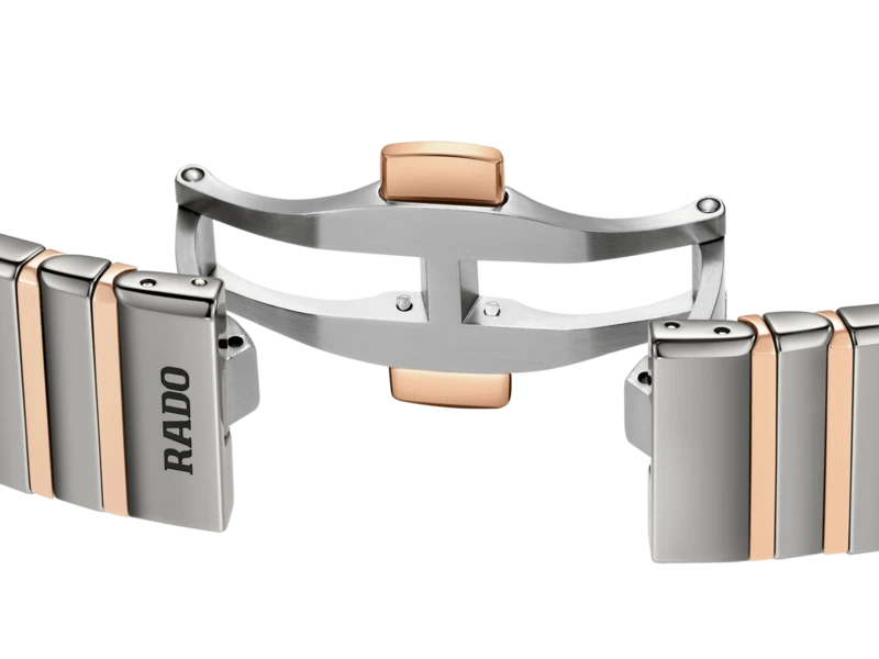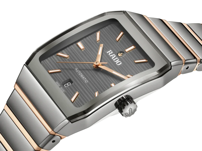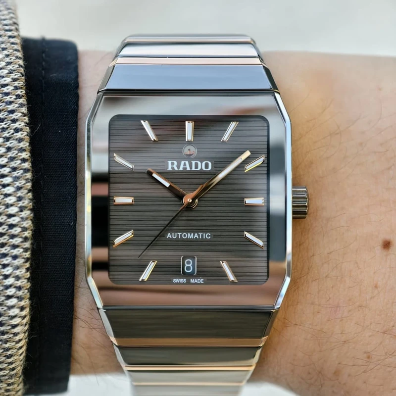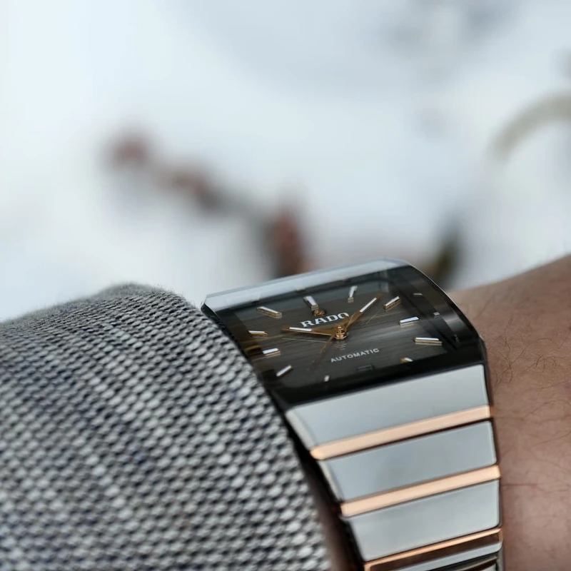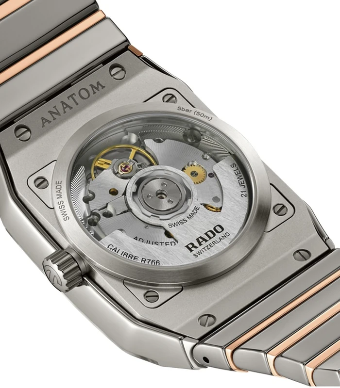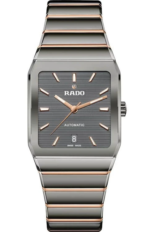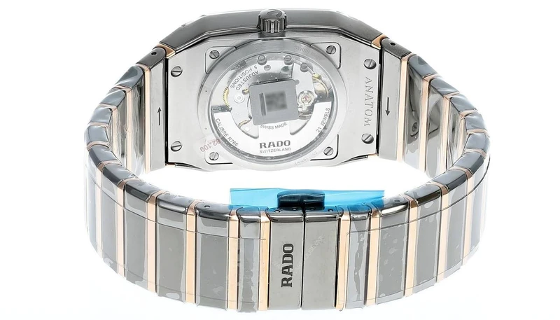 R-62033010 | R10203102 ראדו אנטום החדש יבואן רשמי | דגם אפור פלאזמה עם שילוב פסי זהב רוז | מנגנון אוטומטי כולל 5 שנות אחריות | Rado Anatom 32.5mm Ceramic Automatic Watch R10203102