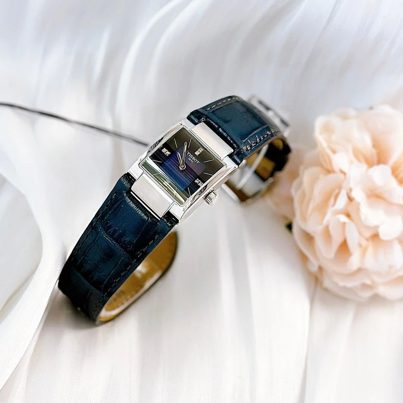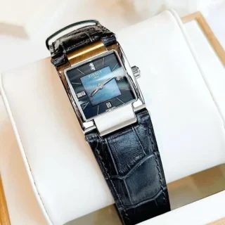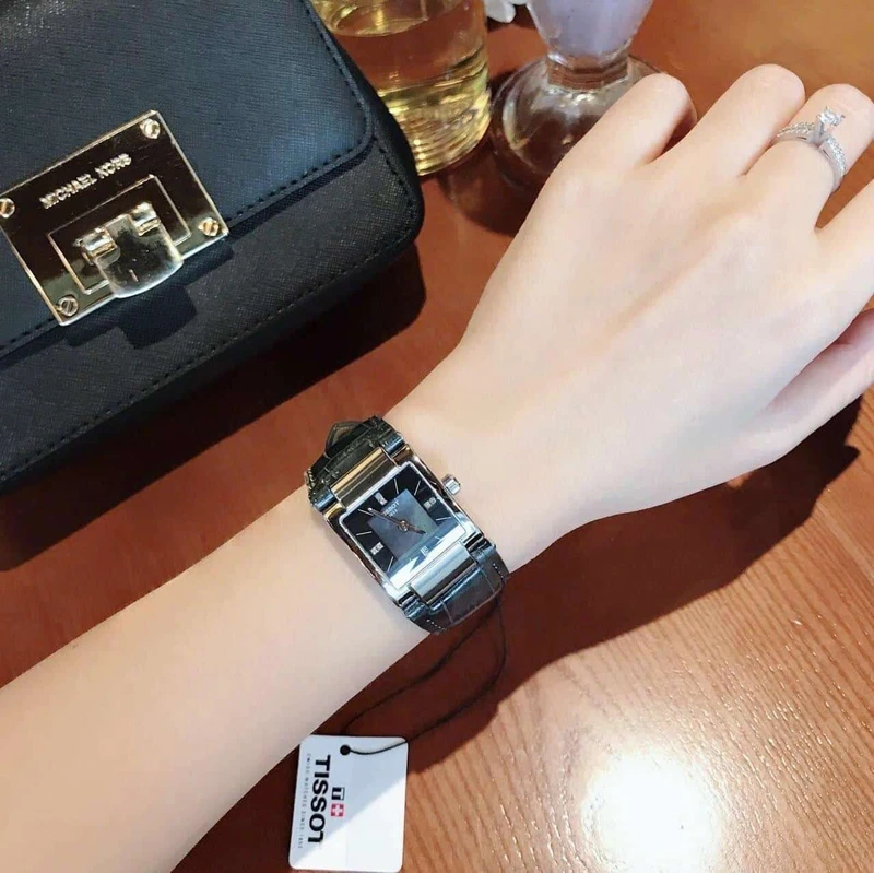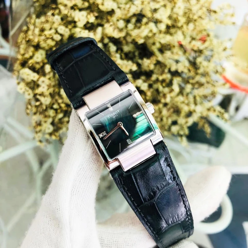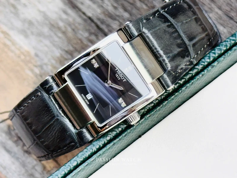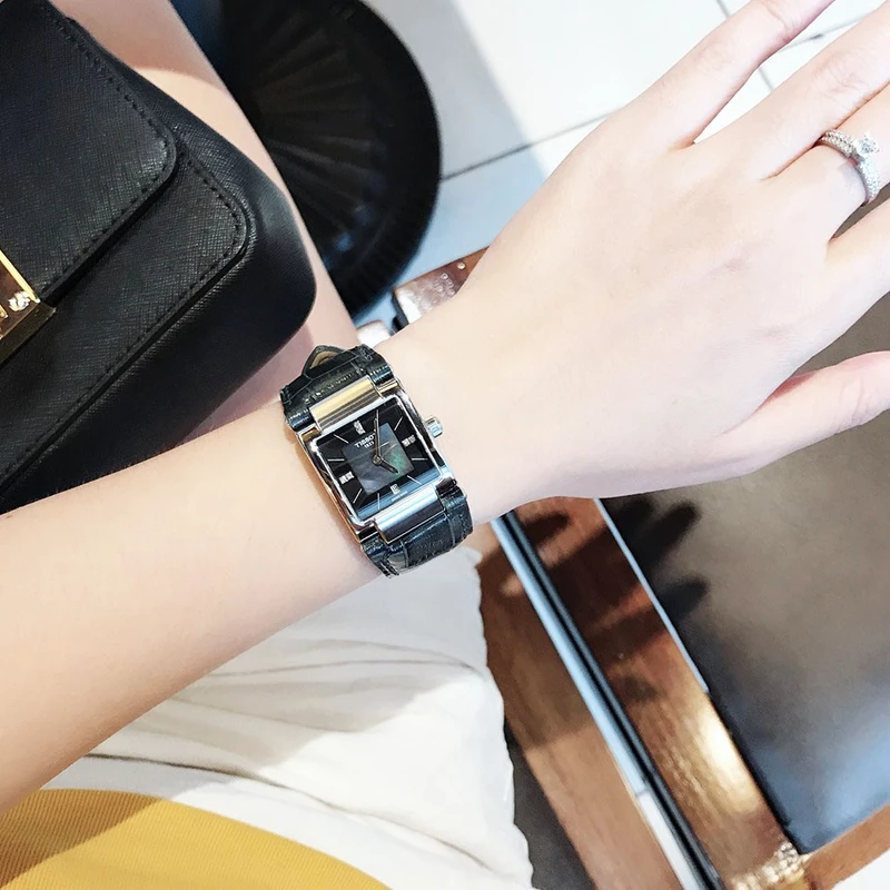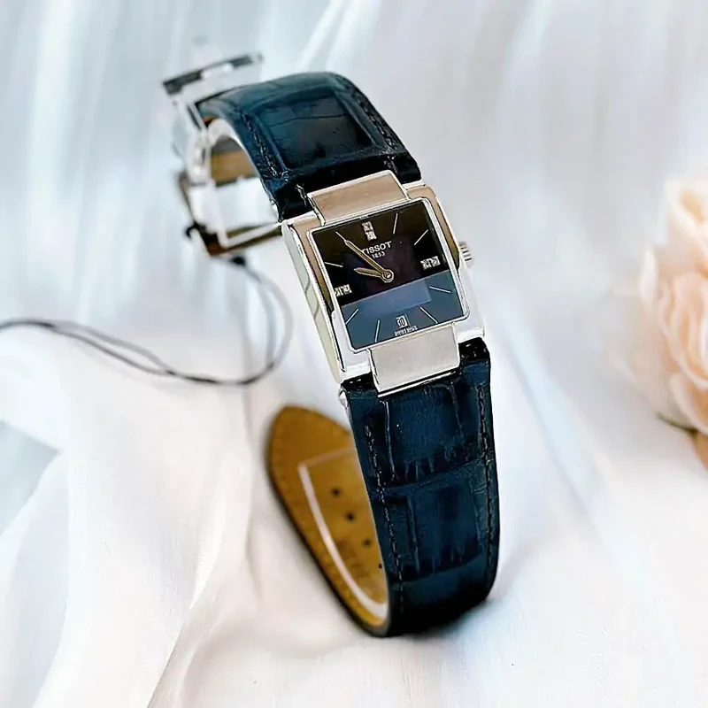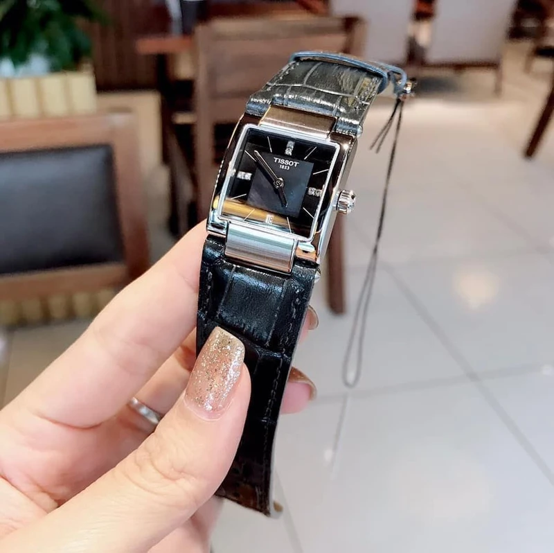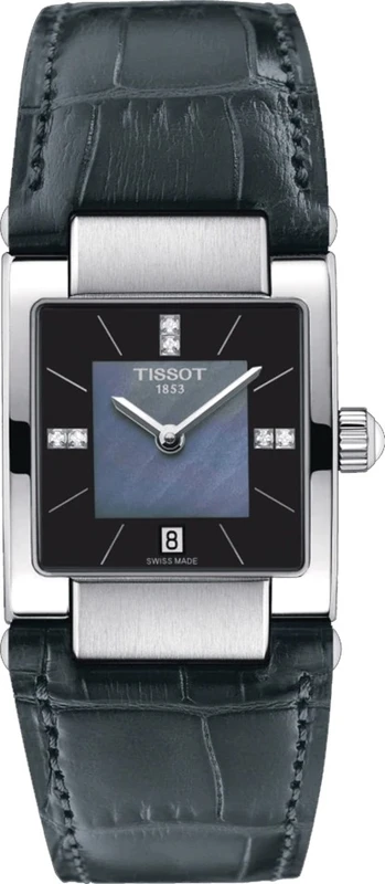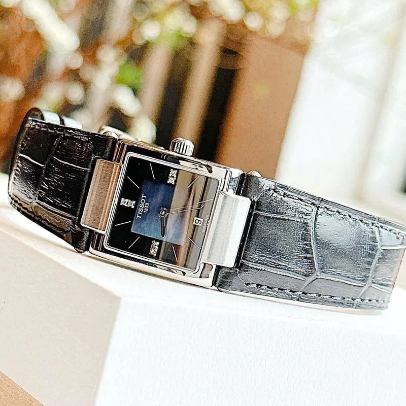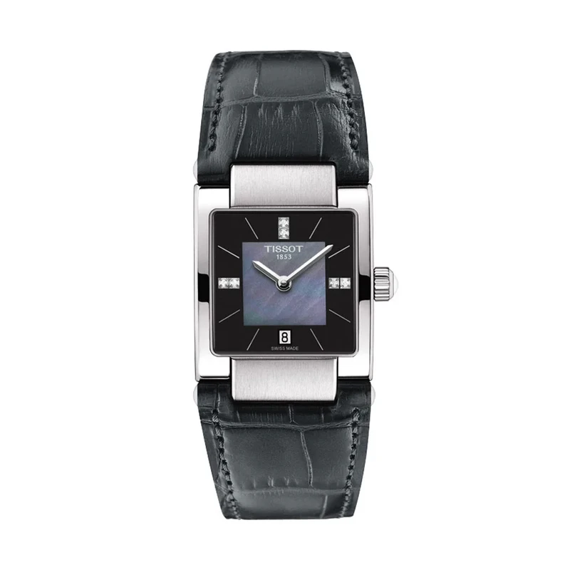 T090.310.16.126.00 שעון מיוחד לאישה של טיסו | דגם אלגנטי ברצועת עור | לוח פנינה משובץ 6 יהלומים | מלאי מוגבל | שנתיים אחריות | Tissot Women's T-Trend Black MOP Dial Watch - T0903101612600