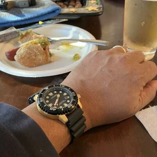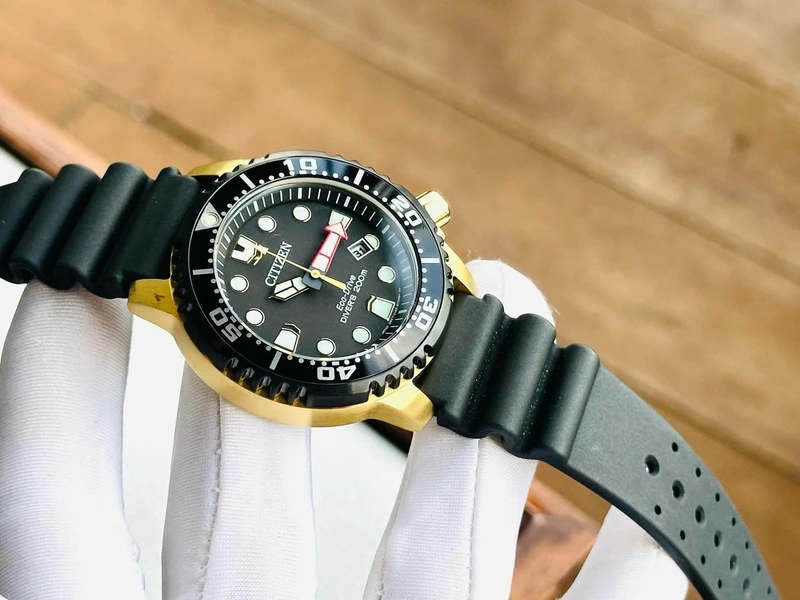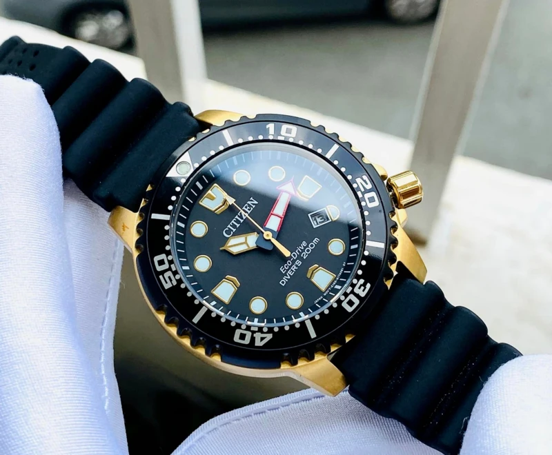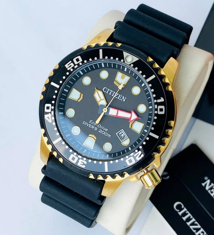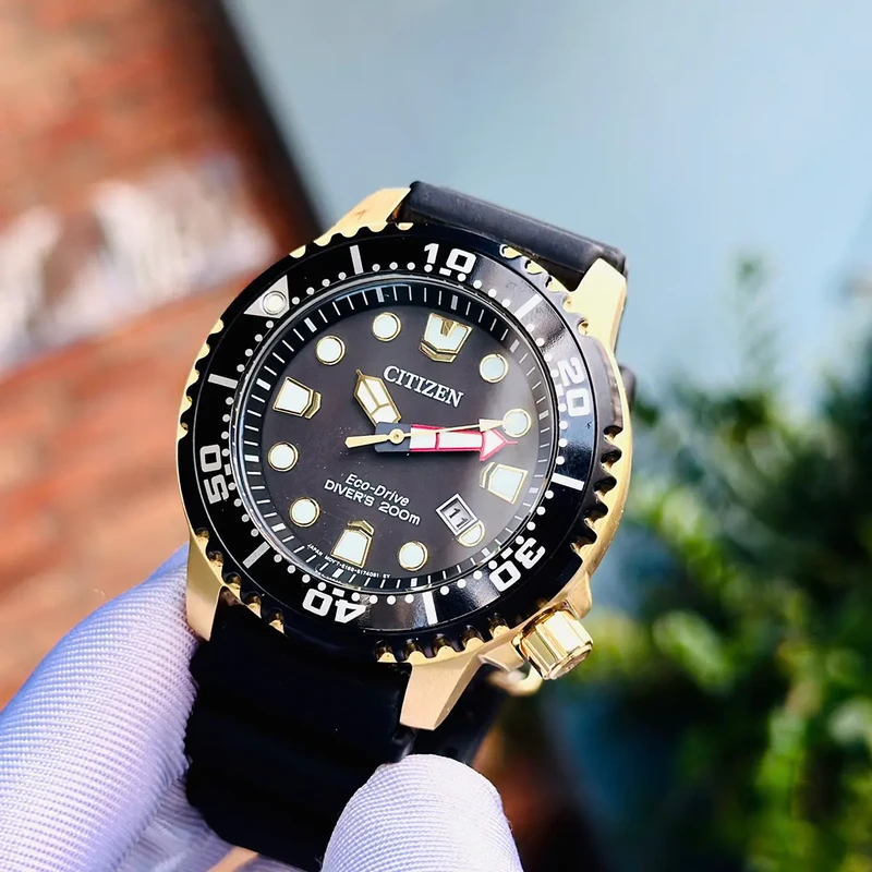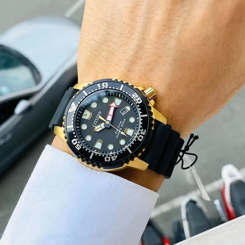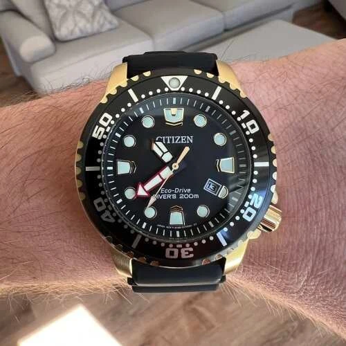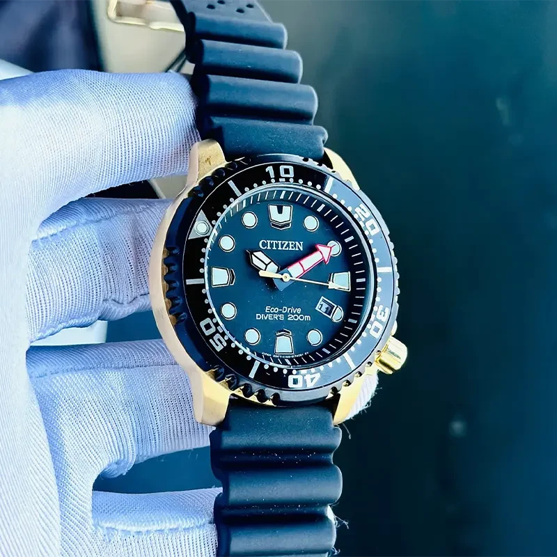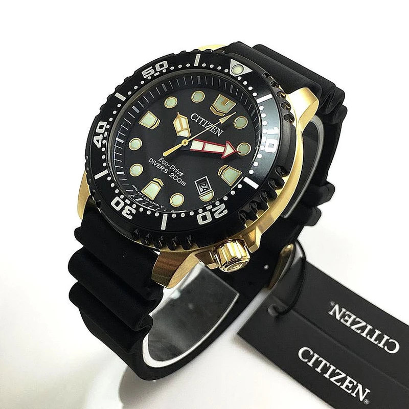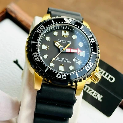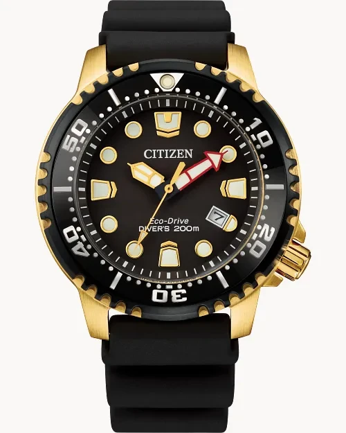 BN0152-06E שעון סיטיזן זהב לגברים מסדרת אקו דרייב צלילה | לוח שחור זרחני | רצועת ספורט | כולל שנתיים אחריות | מלאי מוגבל | Citizen Gents Promaster Dive Watch BN0152-06E