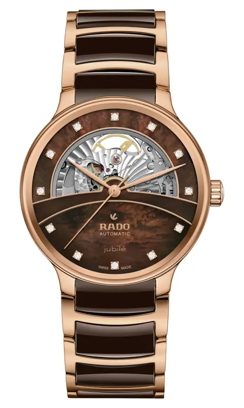R-60283090 | R30028902 | ראדו יבואן רשמי בישראל | דגם סנטריקס סקלטון לגברים | אוטומטי עם 12 יהלומים בלוח פנינה חום | רוז גולד עם קרמיקה חומה | Centrix Automatic Diamonds Open Heart RADO R30028902