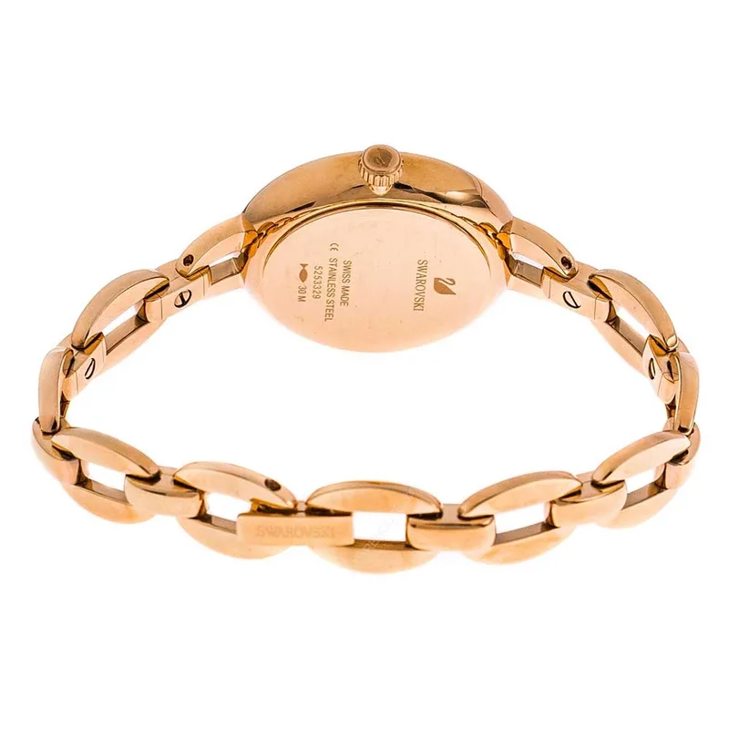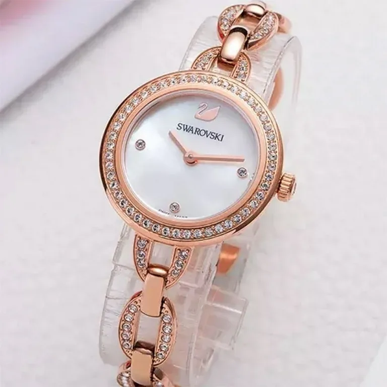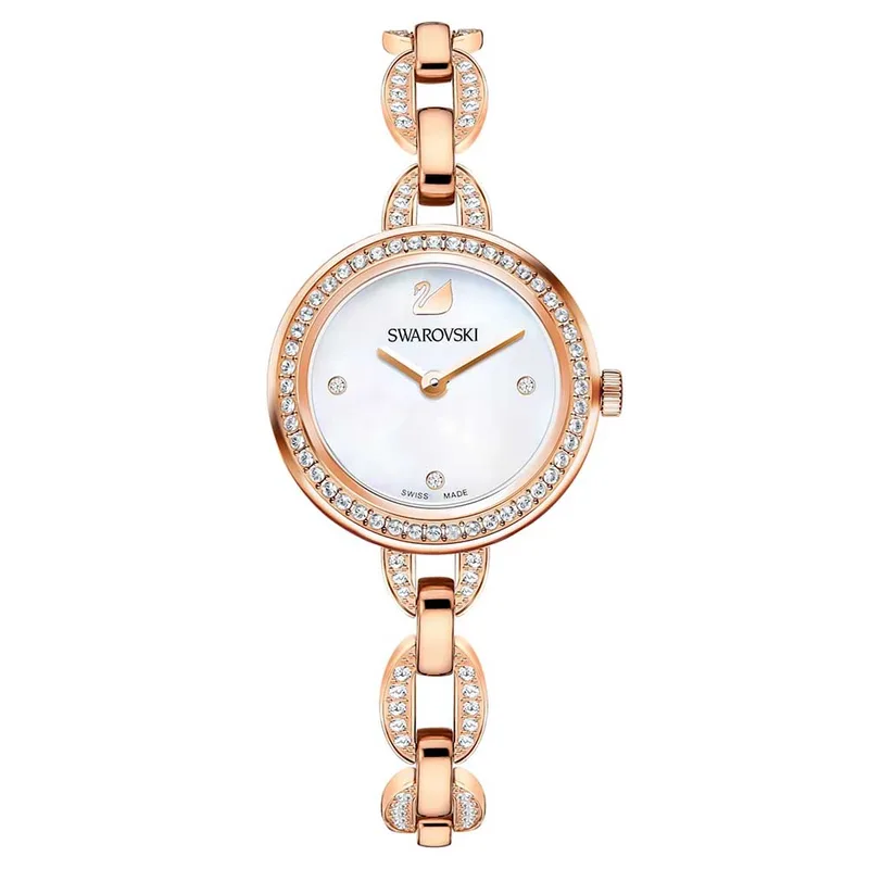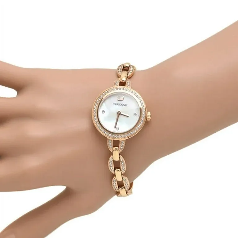 5253329 שעון יד סברובסקי לאישה | דגם צמיד מיוחד אופנתי רוז גולד | אבנים ברצועה ובבאזל | מנגנון שווצרי | שנצתיים אחריות יבואן רשמי | Aila Quartz Crystal White Mother of Pearl Dial Ladies Watch 5253329