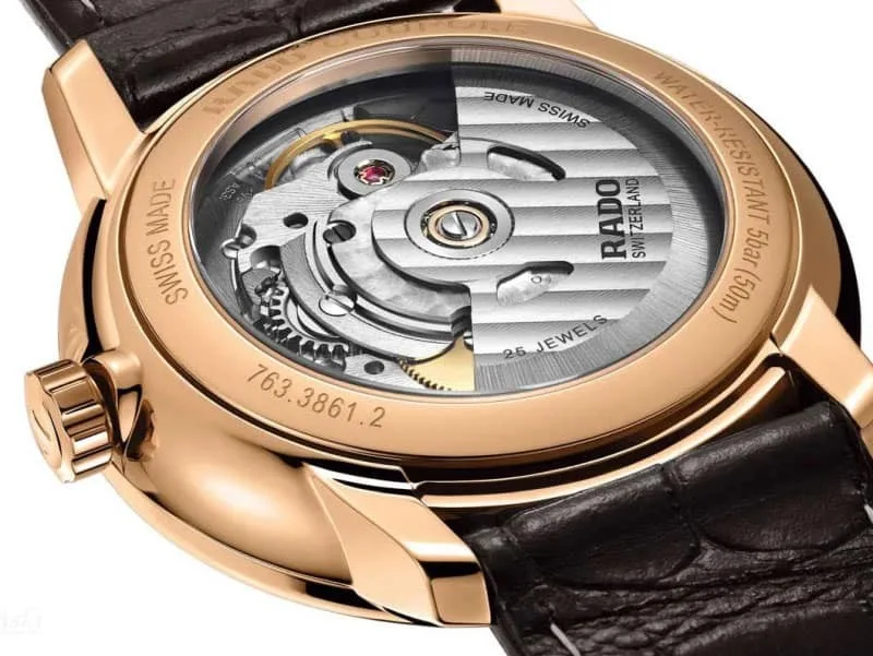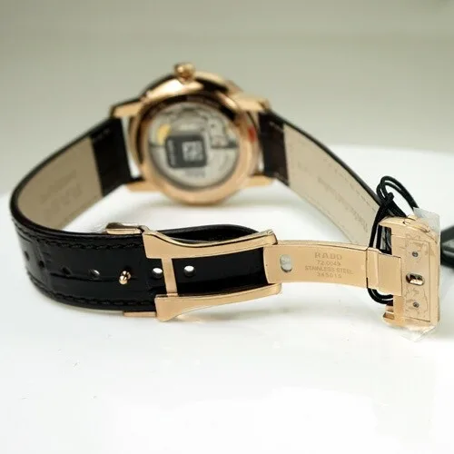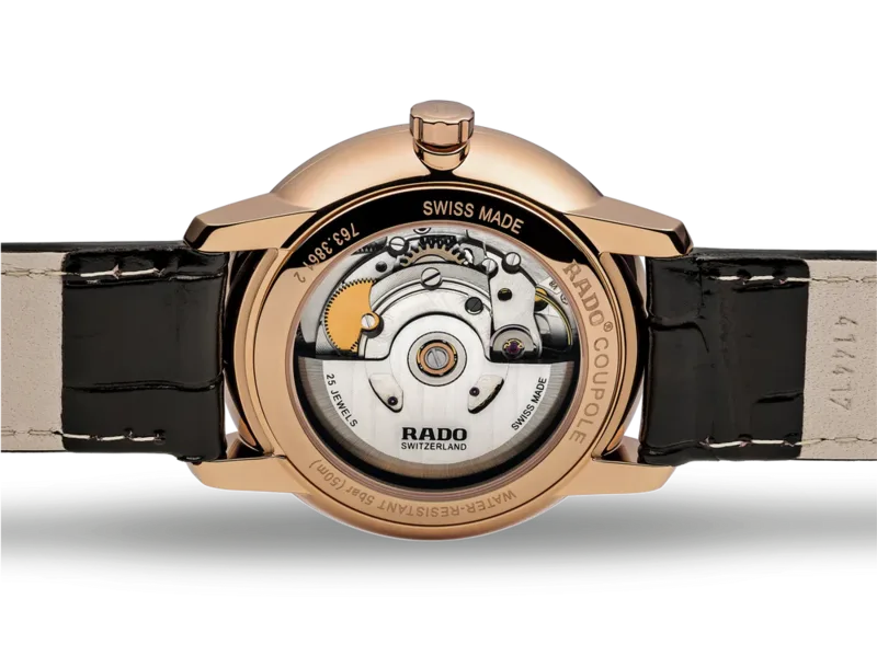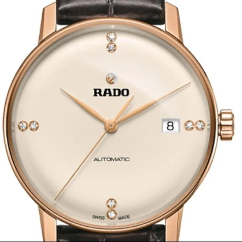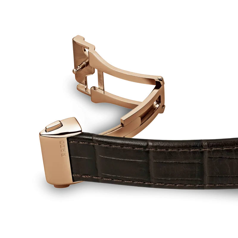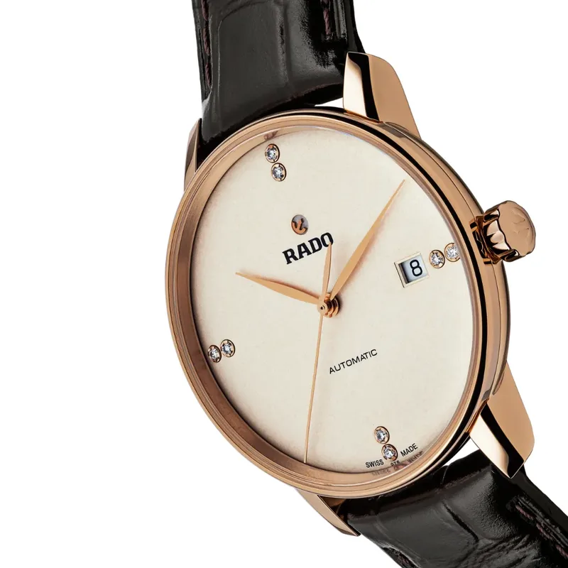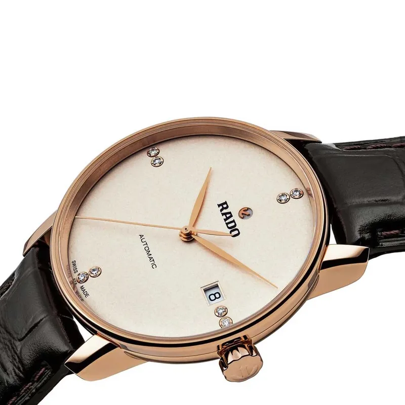 R22861765 שעון יוקרתי לגברים של ראדו מסדרת קופל | דגם אוטומטי אלגנטי בלוח שמפניה משובץ 8 יהלומים | רוז גול רצועה חומה | שנתיים אחריות | Coupole Classic Automatic Diamonds R22861765 - Rado