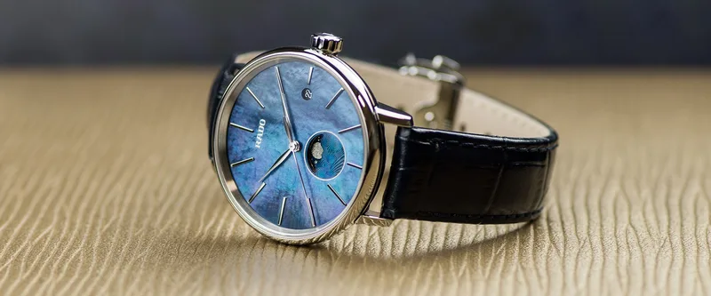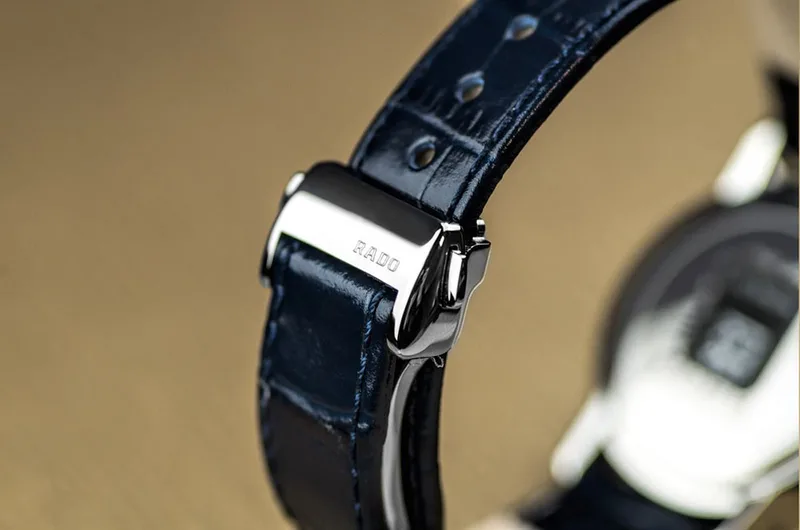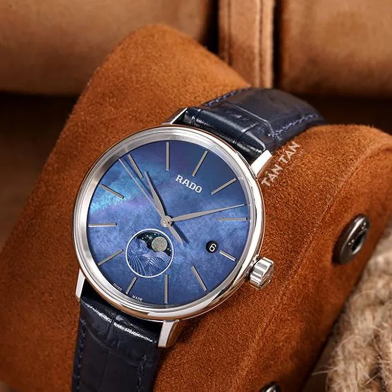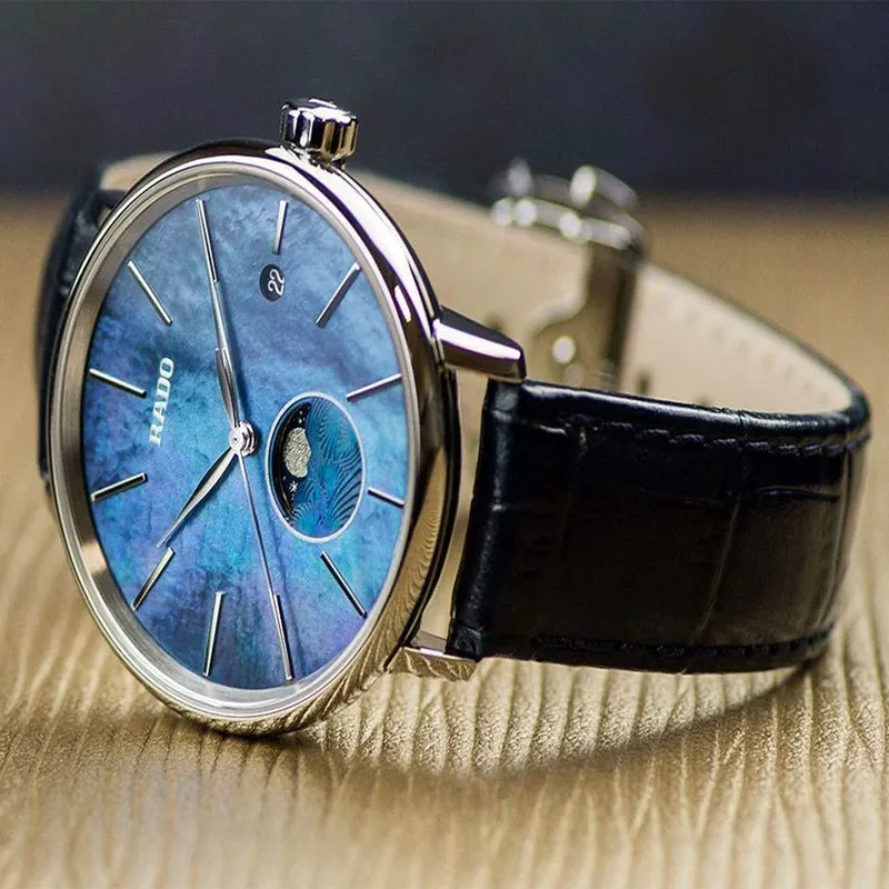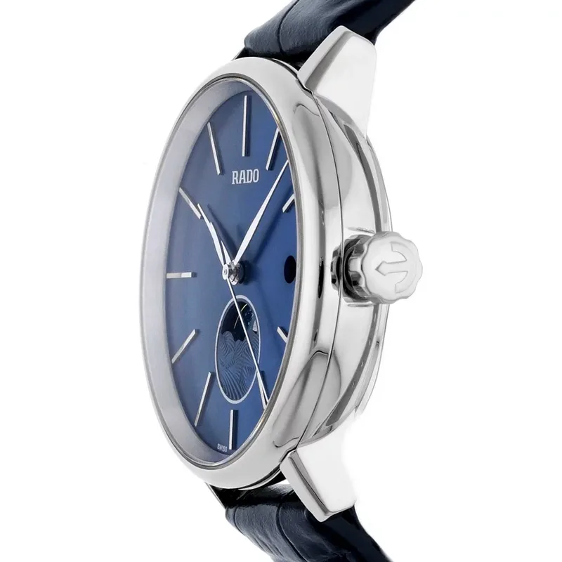 R-38834191 שעון ראדו מיוחד יבואן רשמי | דגם לנשים ברצועת עור כחולה | לוח כחול עם תצוגת ירח | סוגר פטנט | 5 שנים אחריות | מלאי מוגבל | R22883915 | Rado Coupole Classic Moonphase