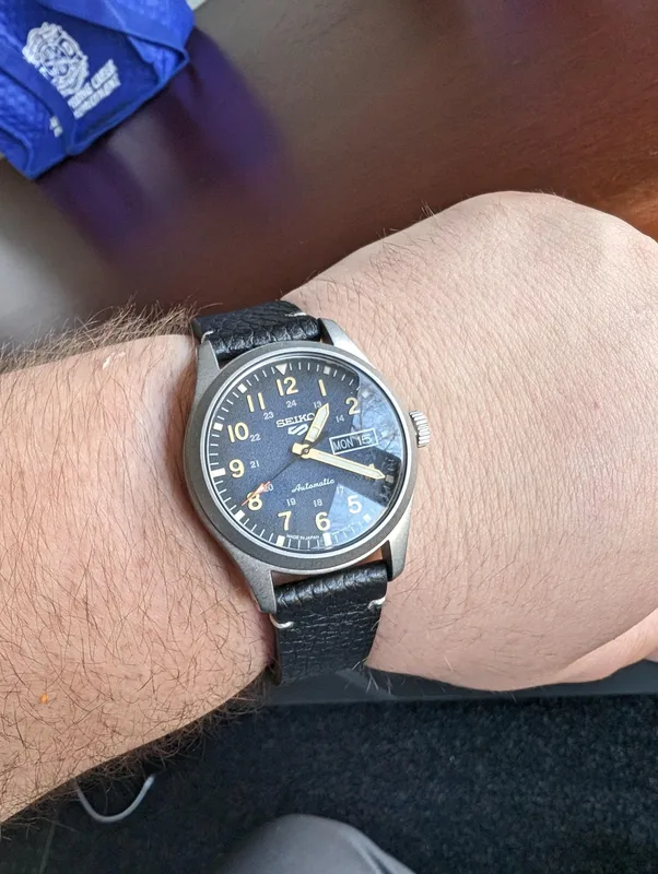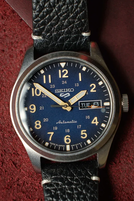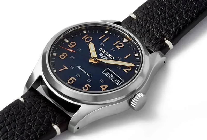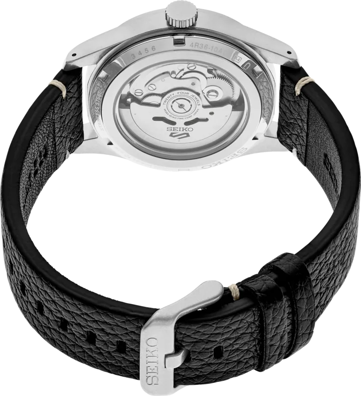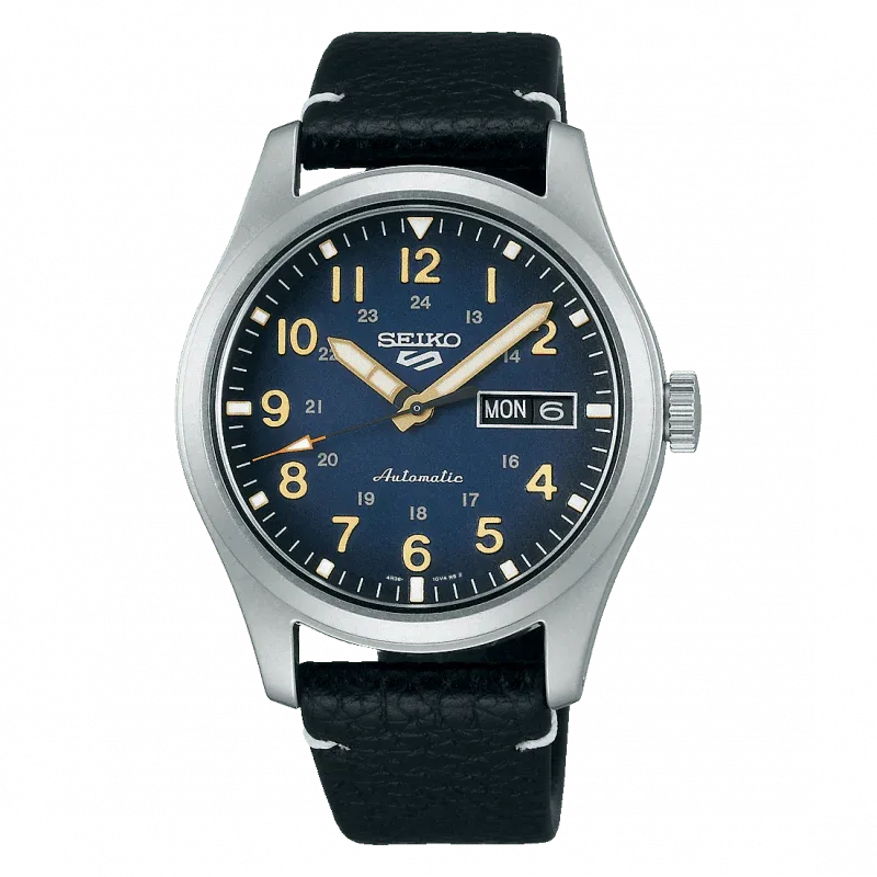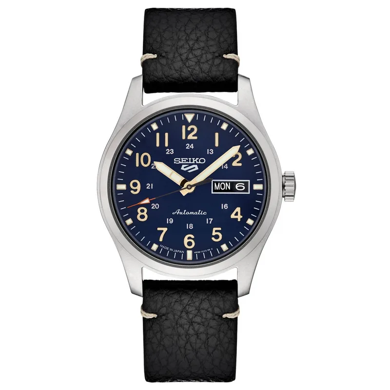 SRPG39 שעון סייקו 5 אוטומטי לגברים | דגם ברצועת עור שחורה לוח כחול זרחני | תאריכון כפול | אחריוות יבואן רשמי | Seiko 5 Automatic Blue Dial Men's Watch SRPG39