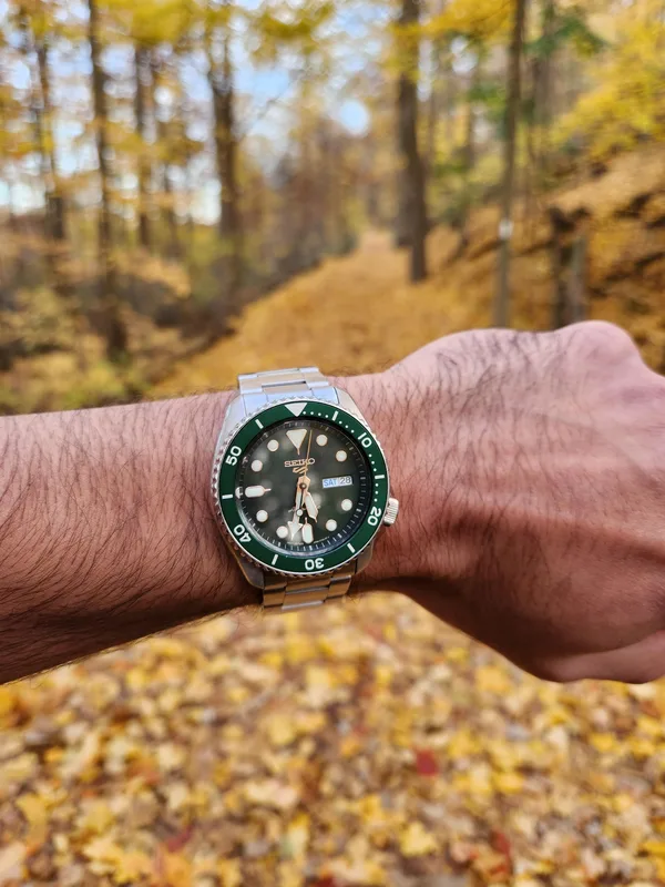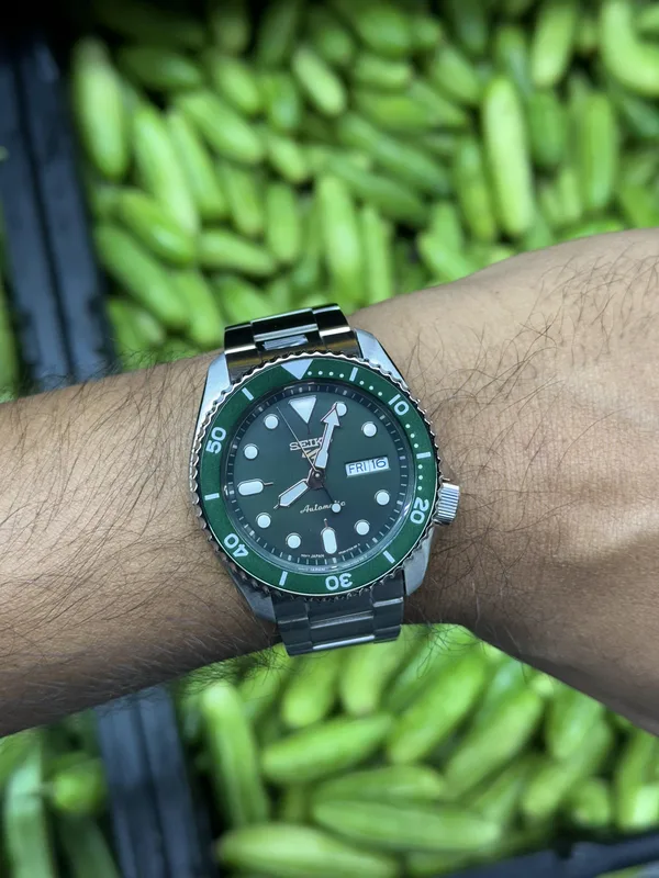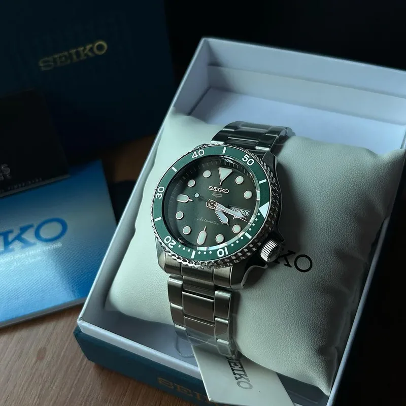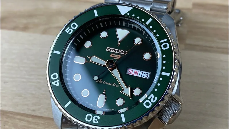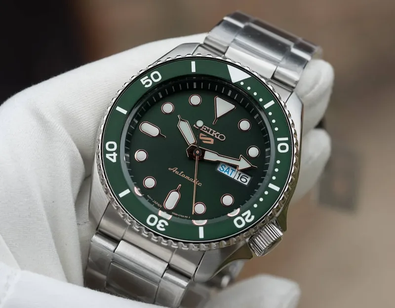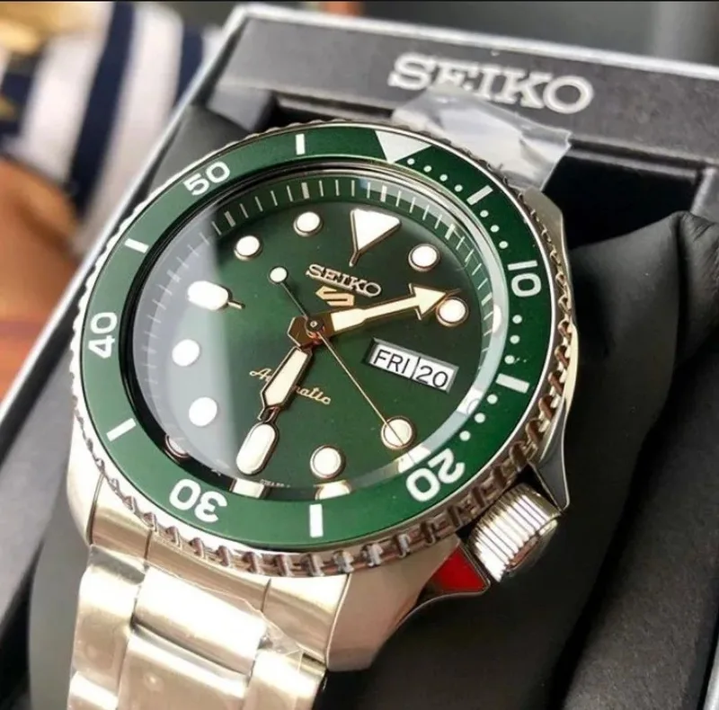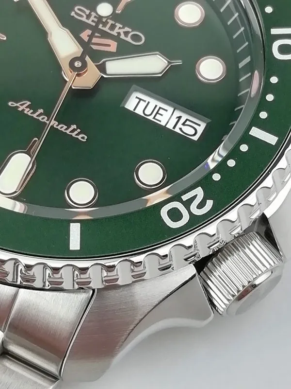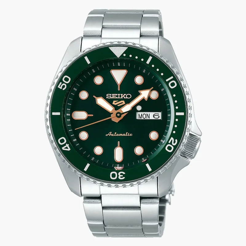שעון SEIKO 5 SPORT בעל לוח ירוק עמוק וסקאלה מסתובבת בצבע תואם.