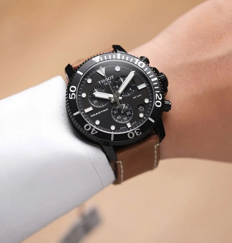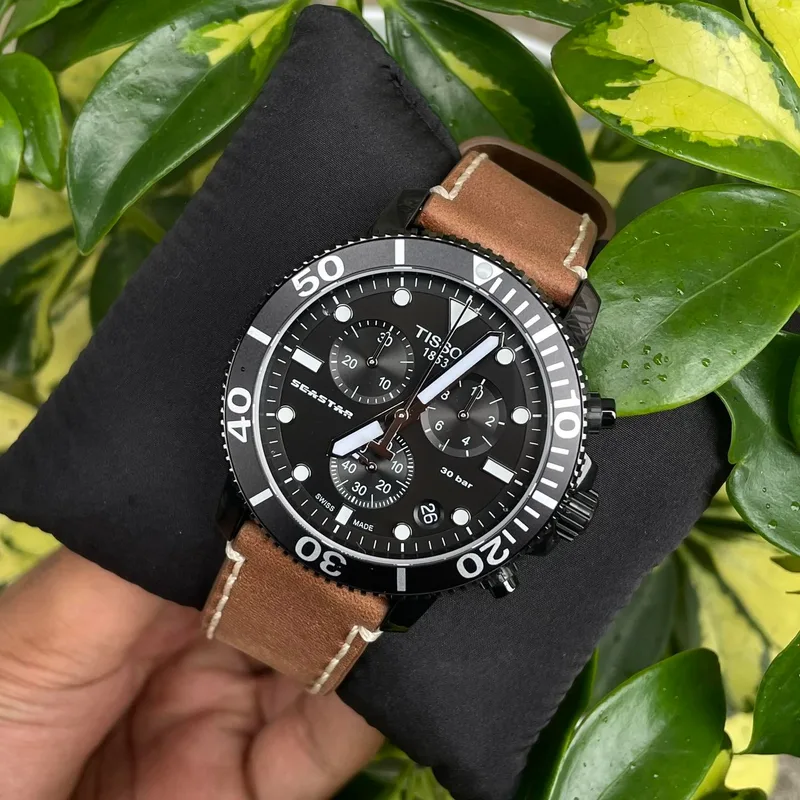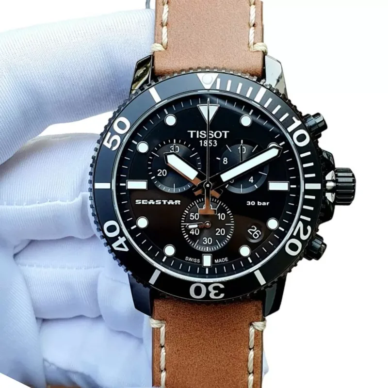 T120.417.36.051.00 שעון אלגנטי ספורטיבי של טיסו מסדרת סי סטאר | דגם שחור כרונוגרף ברצועת עור חומה |שנתיים אחריות | Tissot Mens Seastar 1000 Chronograph 316L Stainless Steel case with PVD T120417360510