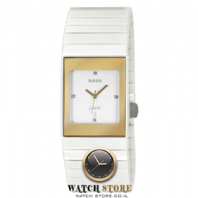 R21984702 שעון יוקרתי יוניסקס 27 מ''מ של ראדו שוויץ | דגמם קרמיקה לבן משובץ 4 יהלומים | שנתיים אחריות | מסגרת זהב | Rado Ceramica Jubile R21984702